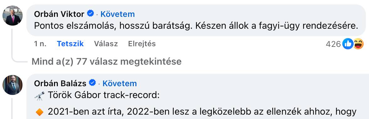 Úgy néz ki, hogy megérte felemlegetni a fogadást, mert Orbán (igen, nyilván személyesen maga kezeli az oldalát) azt írta az elemző bejegyzése alá, hogy „pontos elszámolás, hosszú barátság. Készen állok a fagyi-ügy rendezésére”. Török megköszönte a lehetőséget, jelezve, hogy készen áll elnyalni egy gombócot a miniszterelnökkel.