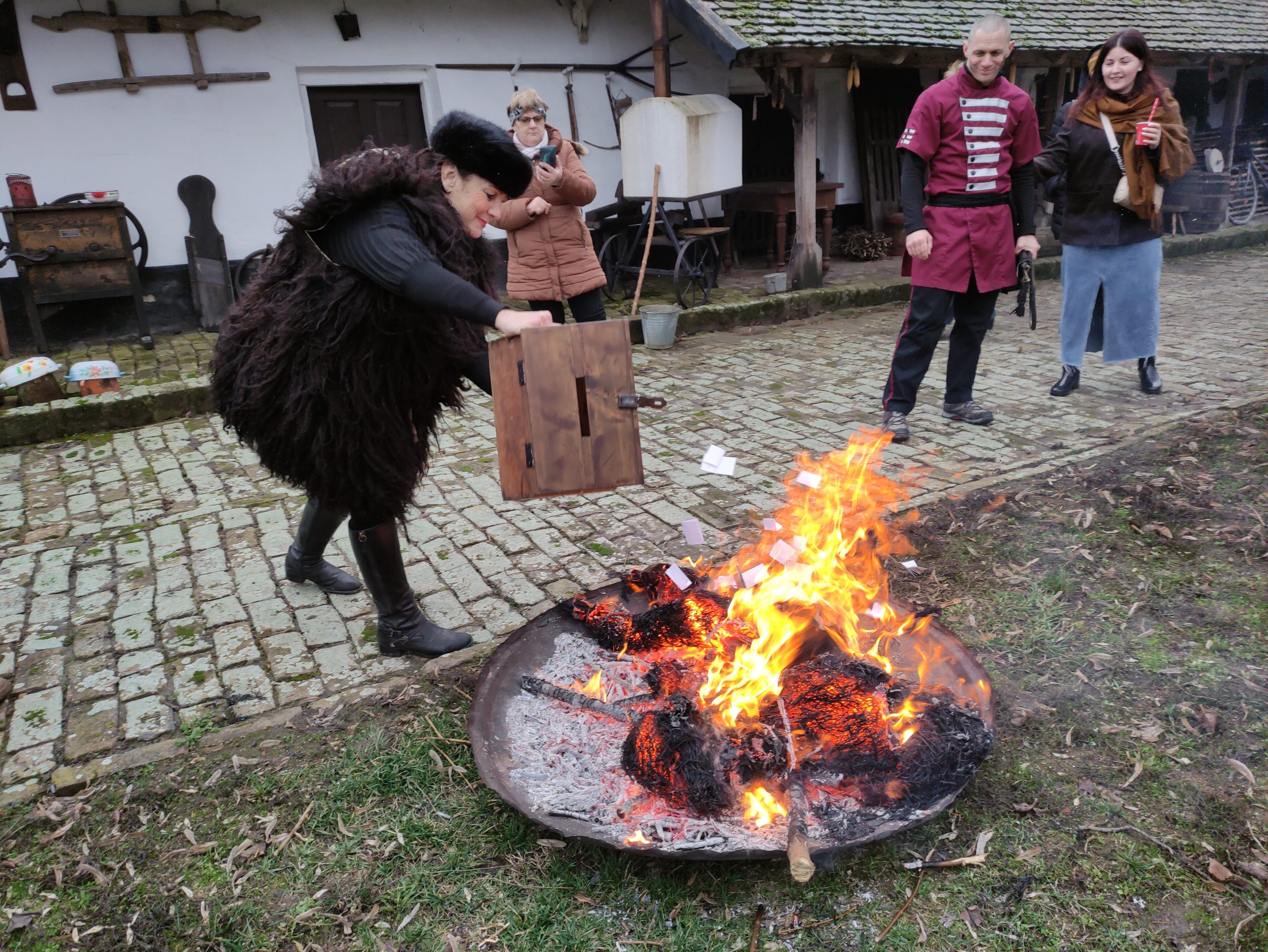 A maskarázón egy kisebb ládába gyűjtötték a résztvevők azokat a papírszeleteket, amelyekre felírhatták gondjaikat, hogy azok elhamvadjanak a telet jelképező bábut felemésztő tűzben.