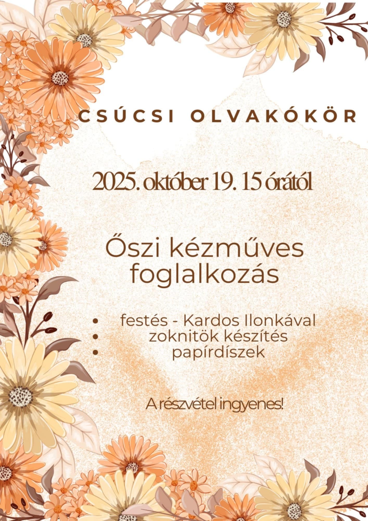 Őszi kézműves foglalkozást rendeznek vasárnap a Csúcsi Olvasókörben