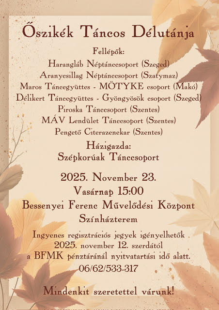 A vásárhelyi Szépkorúak Tánccsoport és vendégei lépnek fel a Bessenyei Ferenc Művelődési Központban november 23-án vasárnap. Szerdától lehet ingyenes jegyet igényelni a programra!