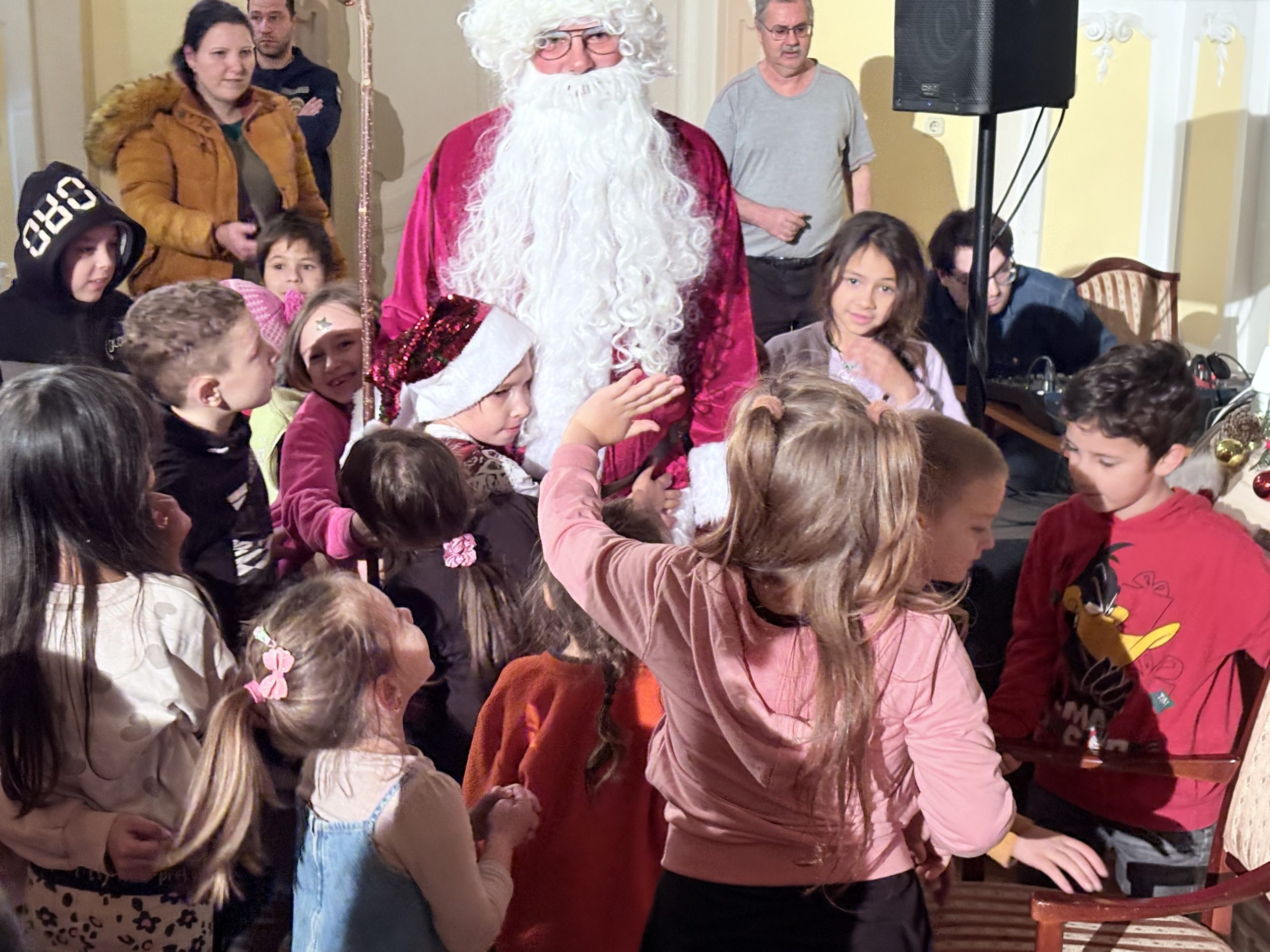 Pillanatok alatt megtelt a nézőtér a Fekete Sas báltermében, ahol a színpadon a legismertebb gyermekdalokkal várták a gyerekeket. A délután fénypontja pedig az volt, amikor Elza a Jégvarázsból csillag formájú konfettit szórt az önfeledten ugráló, táncoló gyerekekre. No és persze a Mikulás érkezése, aki az ajtótól a színpad elejéig tartó pár méteres séta közben annyi ölelést kapott, hogy alig bírt velük.
