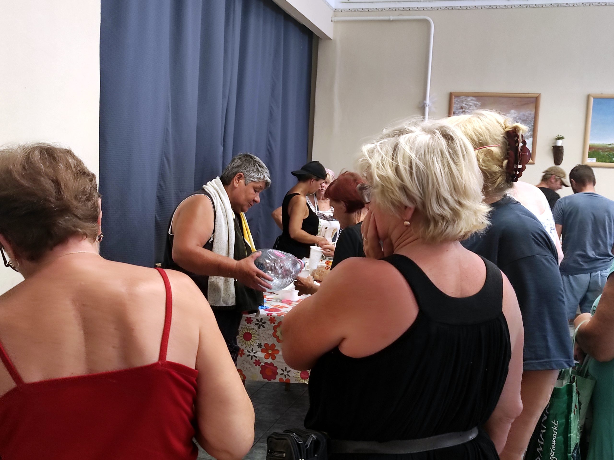 A hetven literes üstökben főzött pacal nem készült el a tervezett dél tájékára, így annak a ránézésre ötven-hatvan embernek, akik helyben fogyasztottak volna, hűsítőt kínáltak a Tabáni Olvasókör nagytermében a megterített asztaloknál. Végül 13 órakor szedték ki az első adag pacalt.
