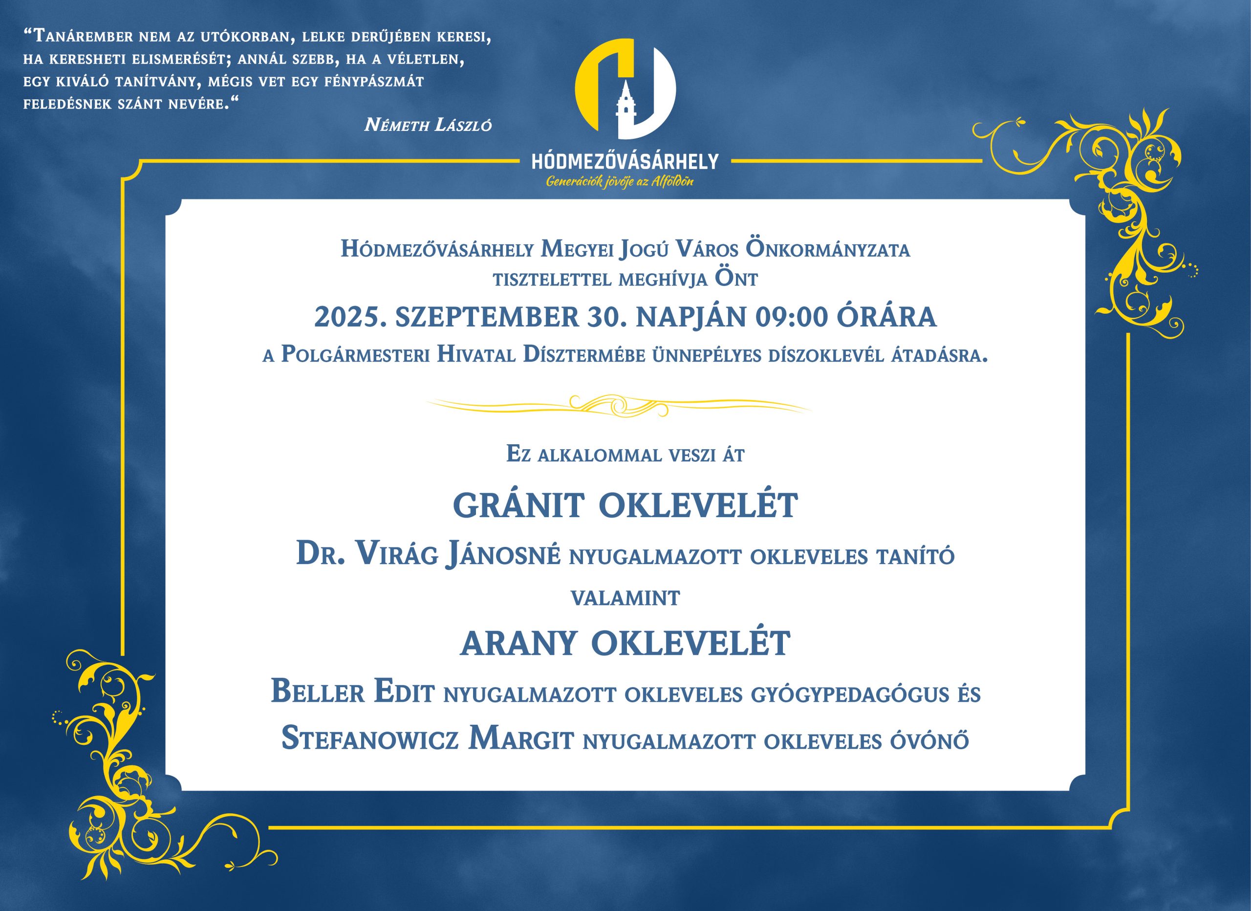 Szeptember 30-án, kedden a Városháza dísztermében fogják átadni Dr. Virág Jánosné nyugalmazott tanító számára gránit díszoklevelét, illetve Beller Edit nyugalmazott gyógypedagógus és Stefanowicz Margit nyugalmazott óvónő részére az arany díszoklevelet.