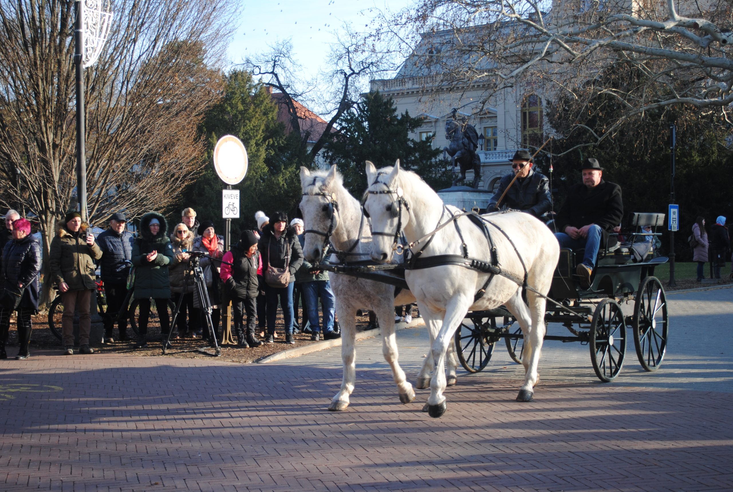 – Ezek a lovak hozzá vannak szokva, hogy fogatban legyenek, úgyhogy nekünk a felkészítés annyi volt, hogy tegnap bejárattuk őket. Ma befogtuk és tudják a dolgukat – mondta Koren Csaba, a Szilvásváradi Állami Ménesgazdaság hófehér lipicai négyes fogatának hajtója, aki, ahogy általában a lovasok, dijugratóként kezdte, és csak később ült át a nyeregből a kocsiülésre. A vásárhelyi felvonulásra érkezett fogat heréltekből és egy ménből állt. – Versenyeztem, azaz hivatalos sportoló is voltam, de most már olyan jó 30 éve fogathajtó vagyok – tette hozzá.