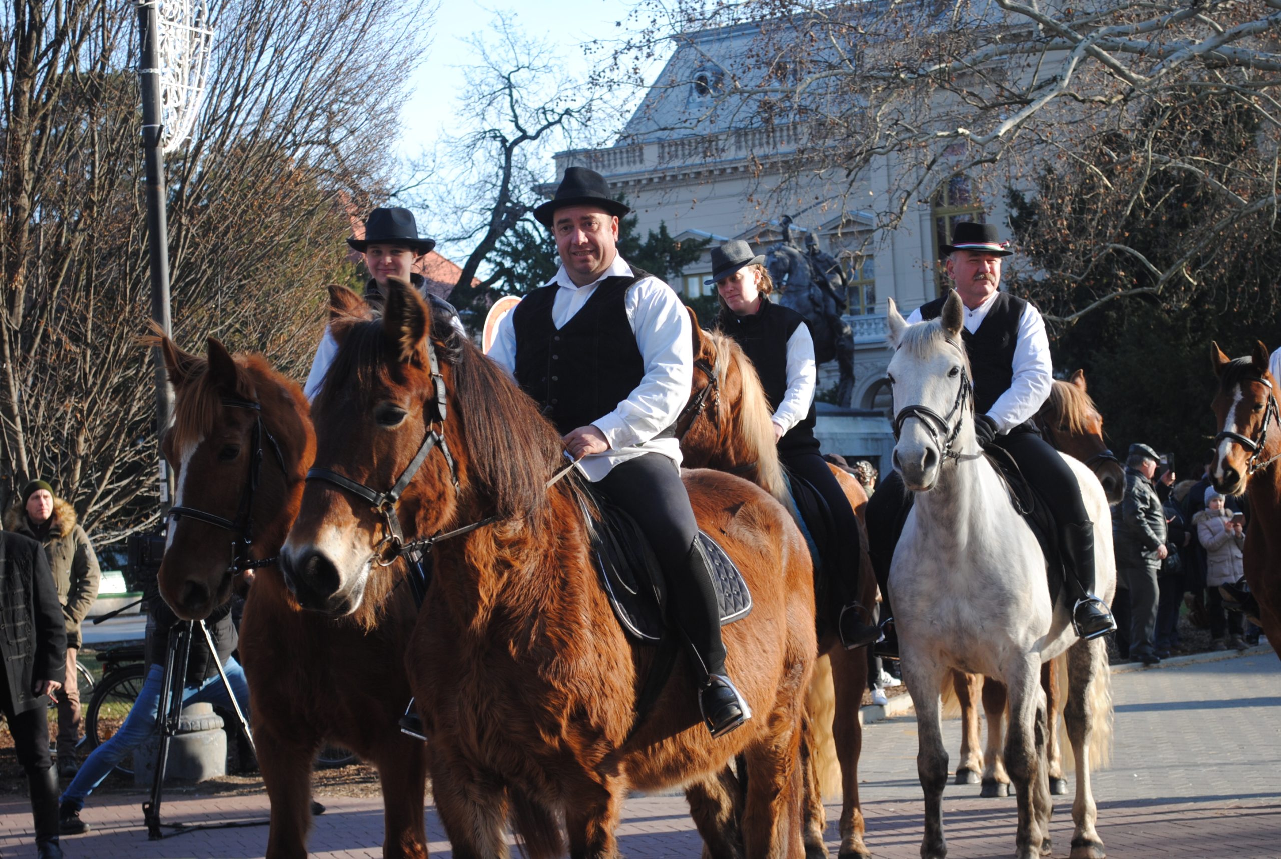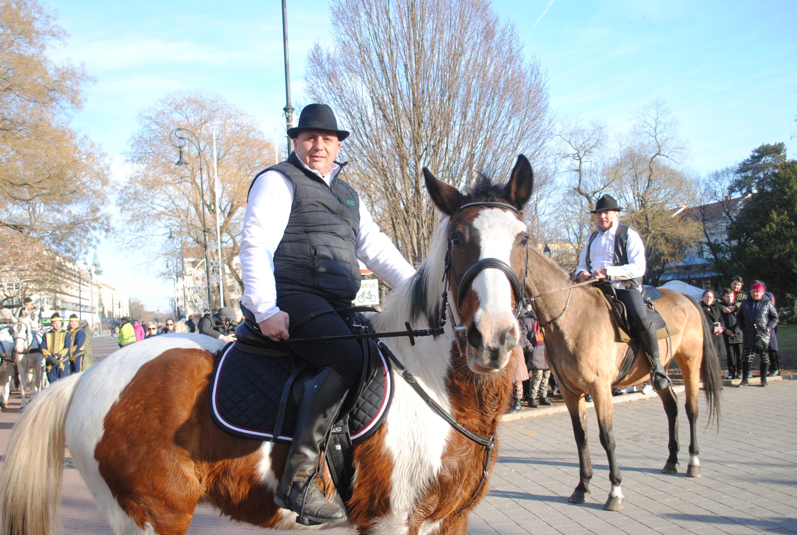 – Továbbra is meg akartuk jeleníteni a gazdabál előtt a lovat, de úgy, hogy összehoztuk egy másik régi hagyománnyal. Azzal, hogy egykoron a városnak két bandériuma is volt, a huszárok lévén egy katonai és egy parasztbandérium is. Ez utóbbiban résztvevők az öltözéke a fekete kalap, fekete mellény, fehér ing, fekete csizma volt. Lehetett látni, hogy ilyen öltözékbe jelentek most már a most felvonult lovasok, akik megértették, hogy ebben az öltözékben éltetik tovább ezt a hagyományt is – vázolta fel, hogyan alakult újjá a 2006 óta újra megrendezett gazdabálak előtti lovas, fogatos felvonulás hagyománya.
