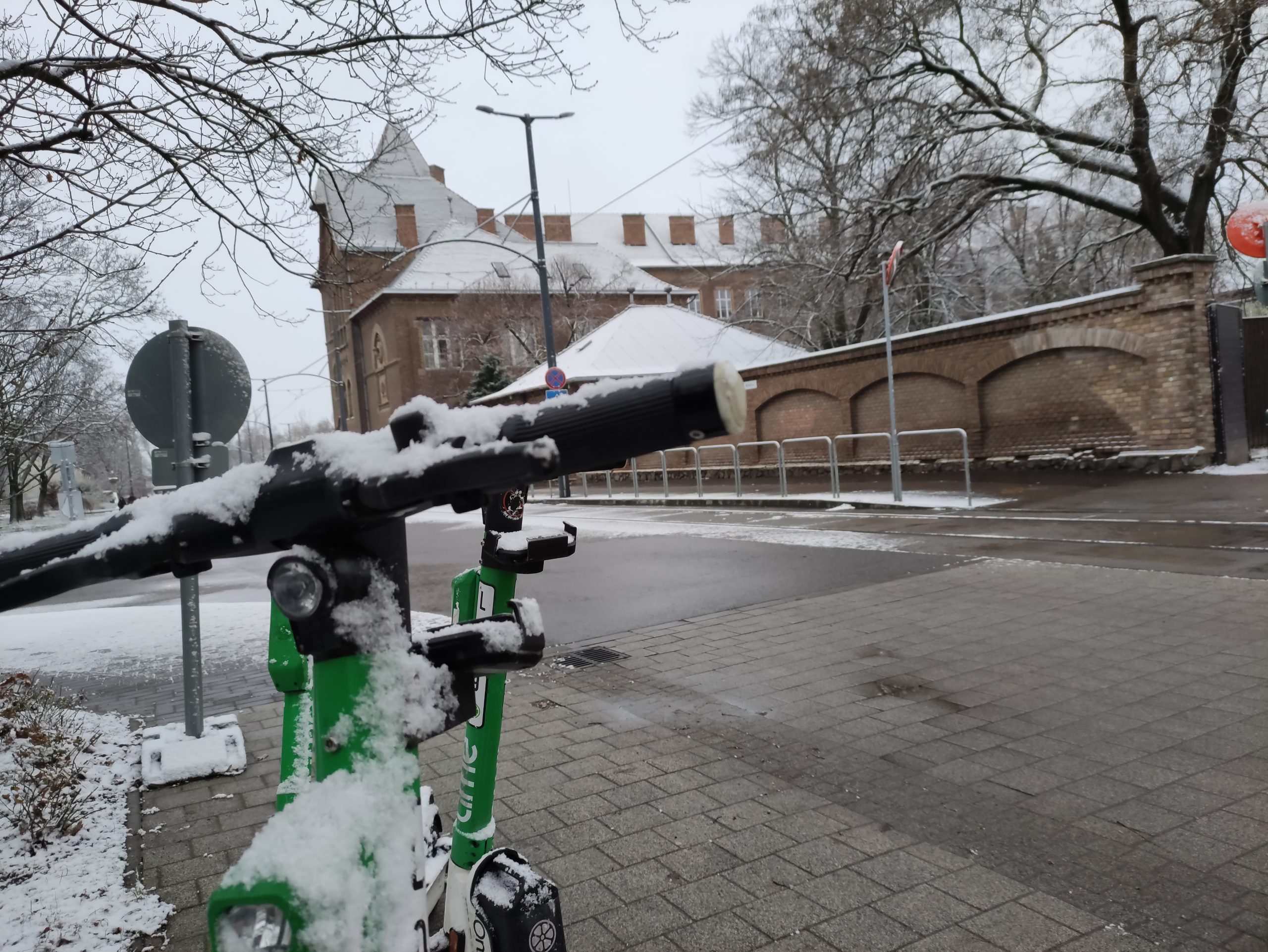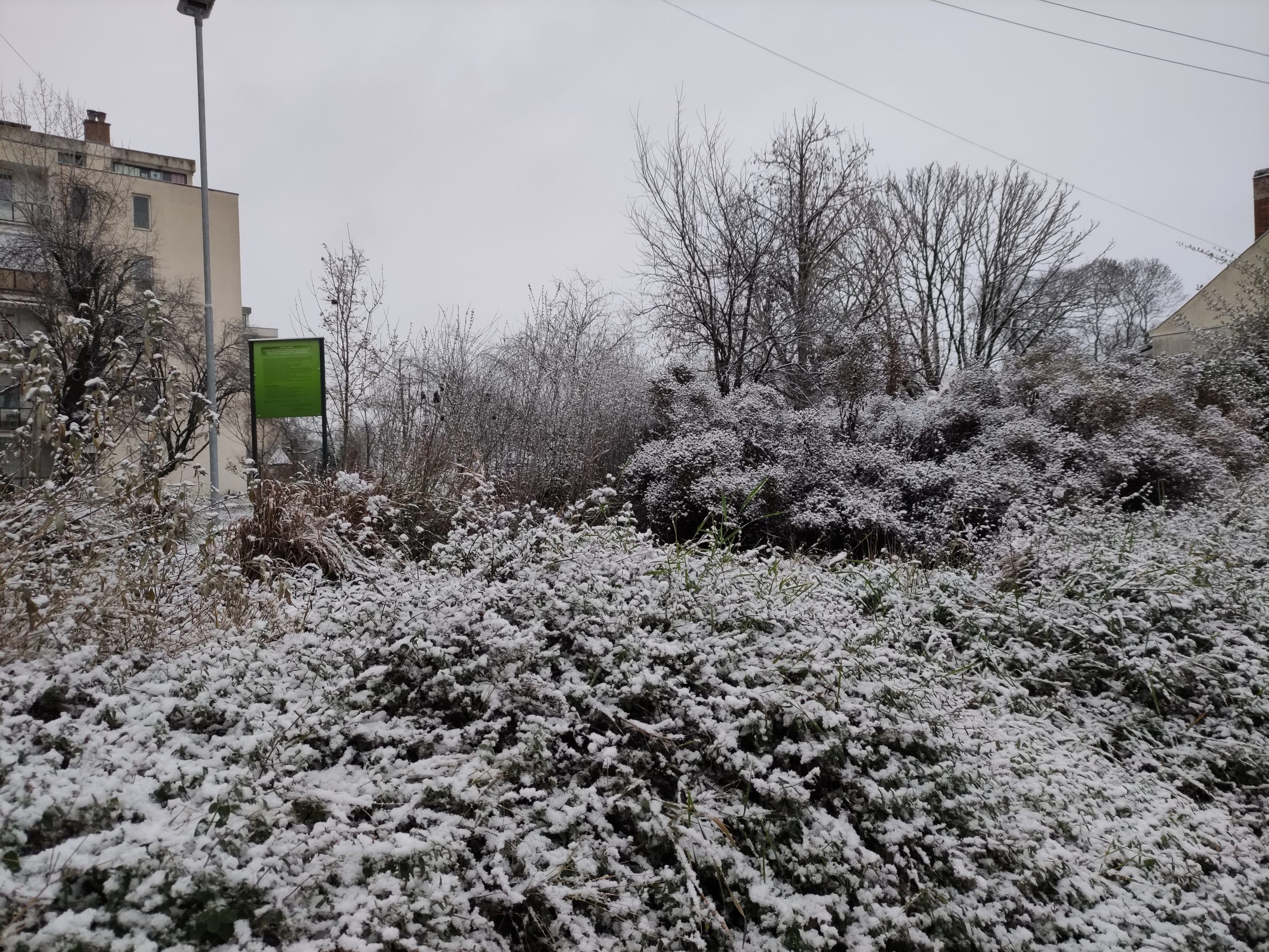 A hó éjszaka apró szemekben hullott, és a mínusz egy Celsius-fok körüli hőmérsékletnek köszönhetően főként a zöldterületeken, illetve a háztetőkön maradt meg.