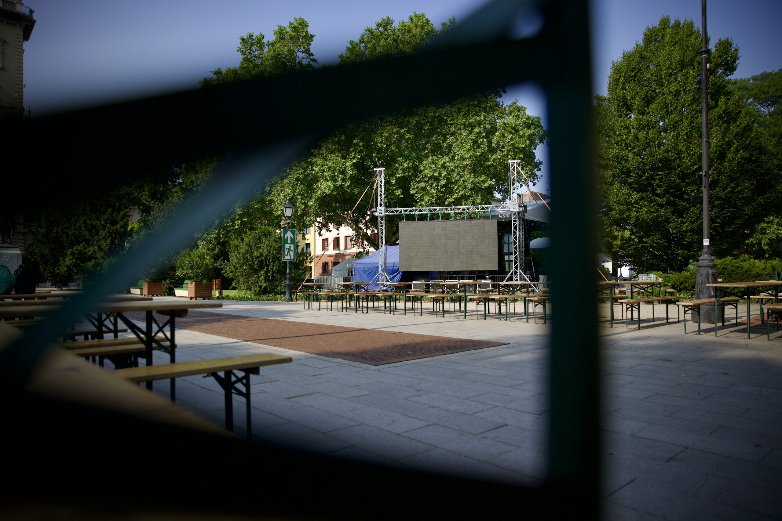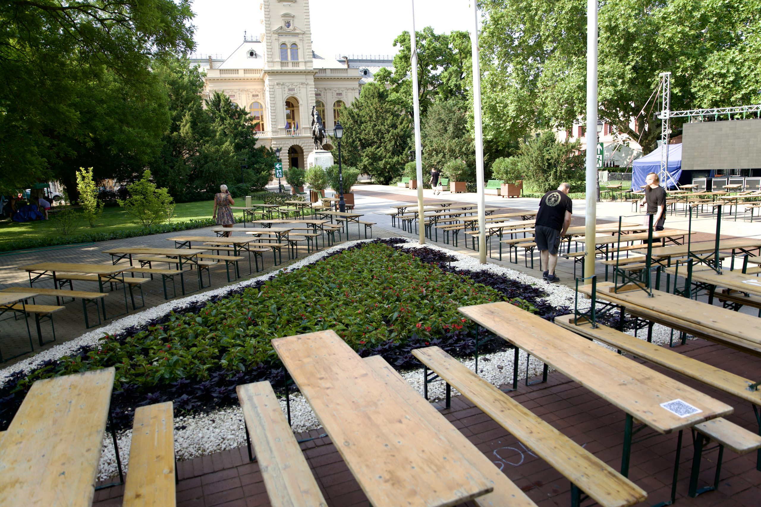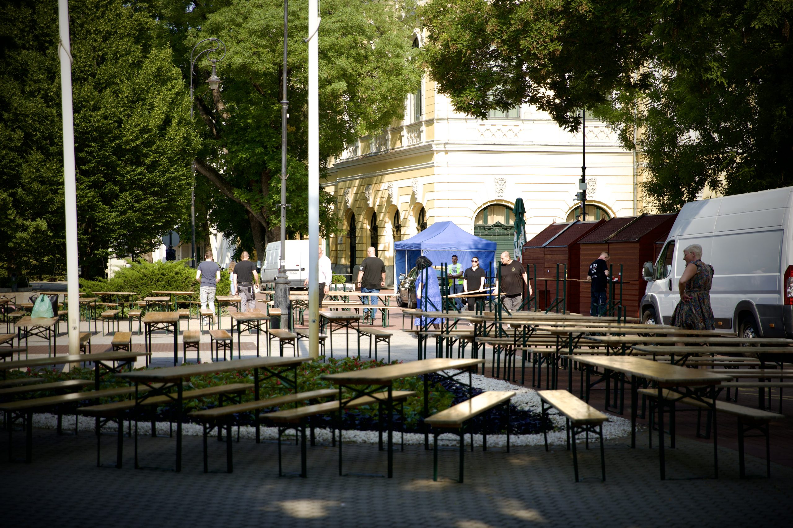 A színpad, a padok, a sörárusok bódéi, a teljes Kossuth tér készen áll a ma este kezdődő háromnapos sörfesztiválra.