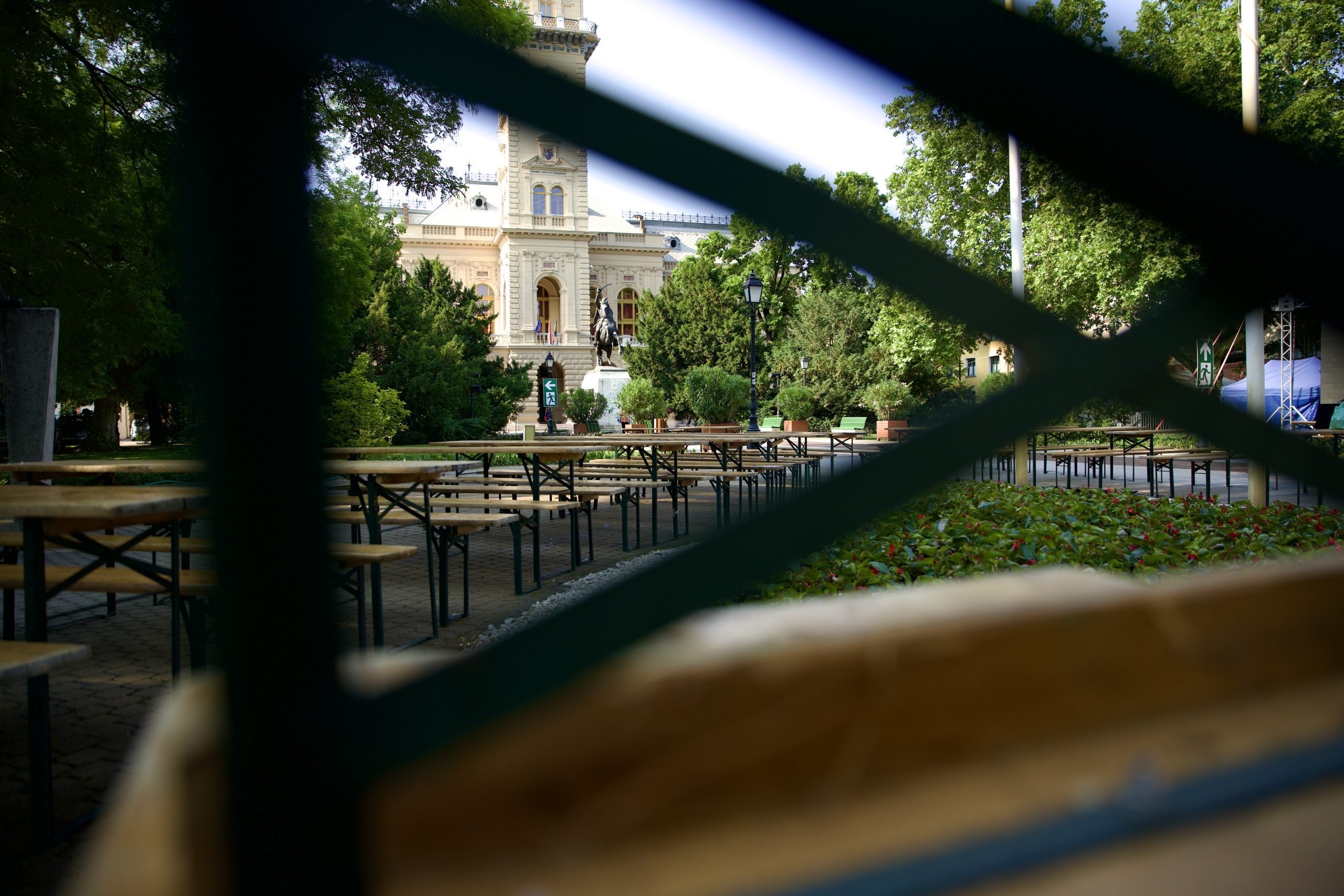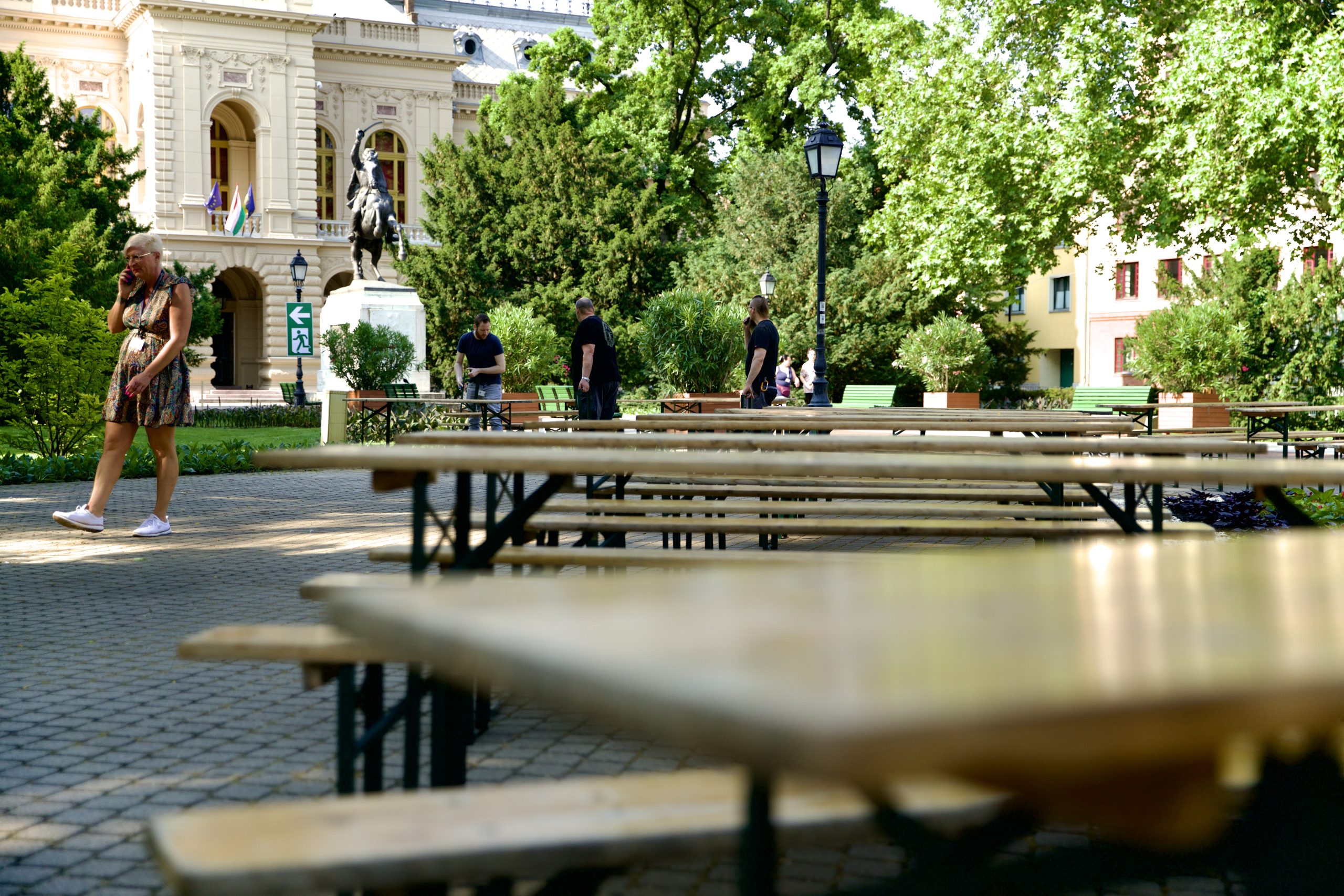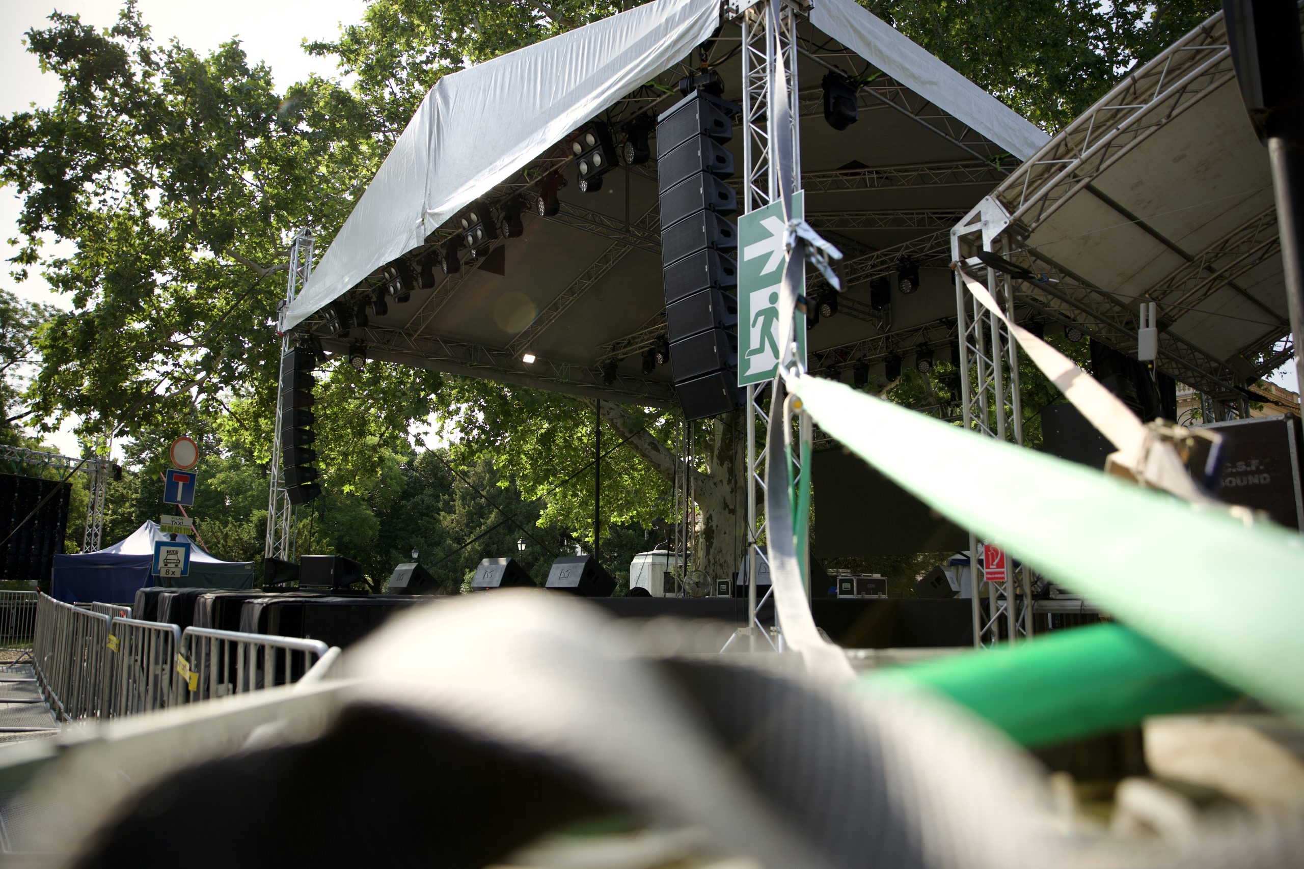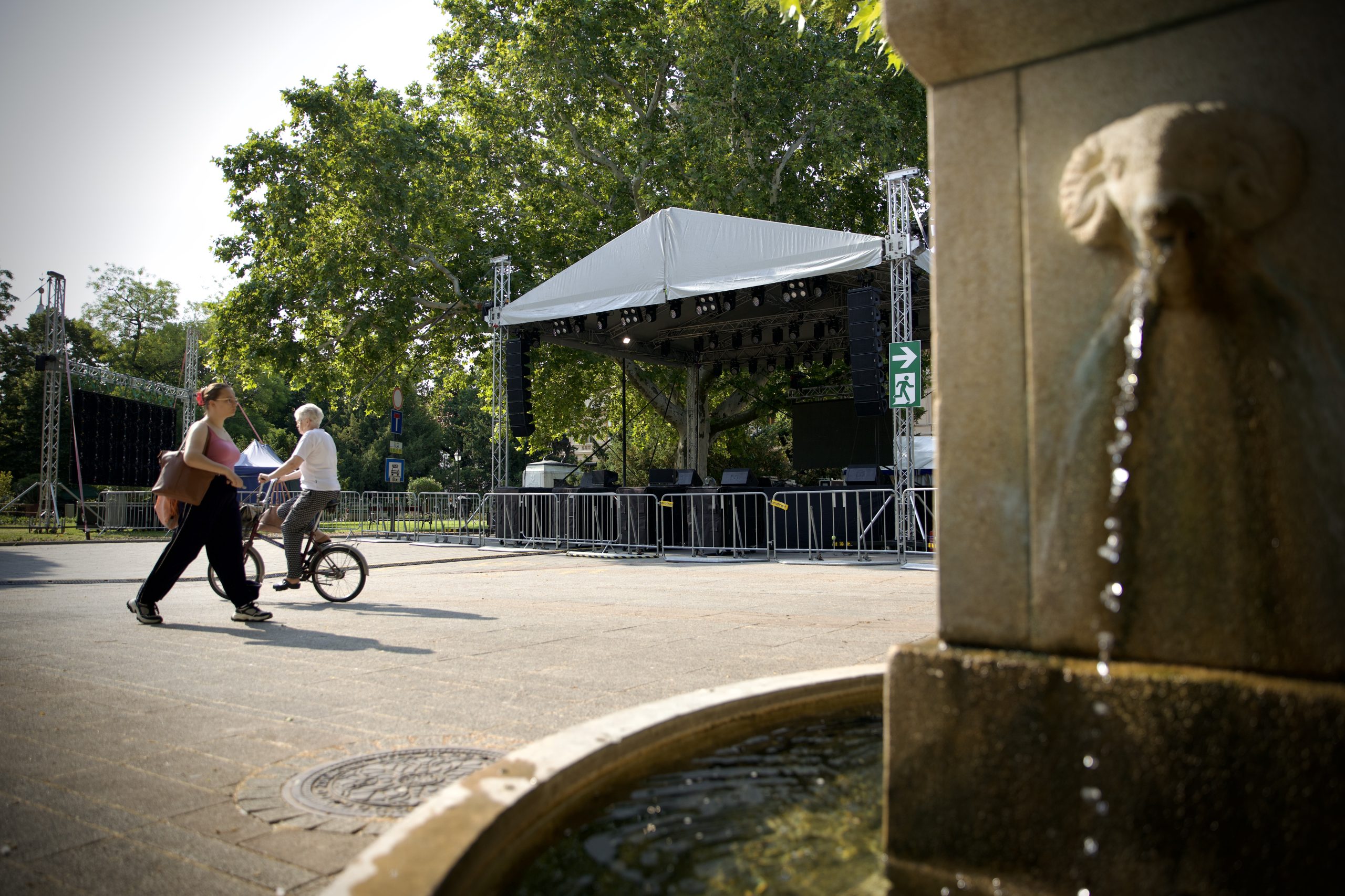 A színpad, a padok, a sörárusok bódéi, a teljes Kossuth tér készen áll a ma este kezdődő háromnapos sörfesztiválra.