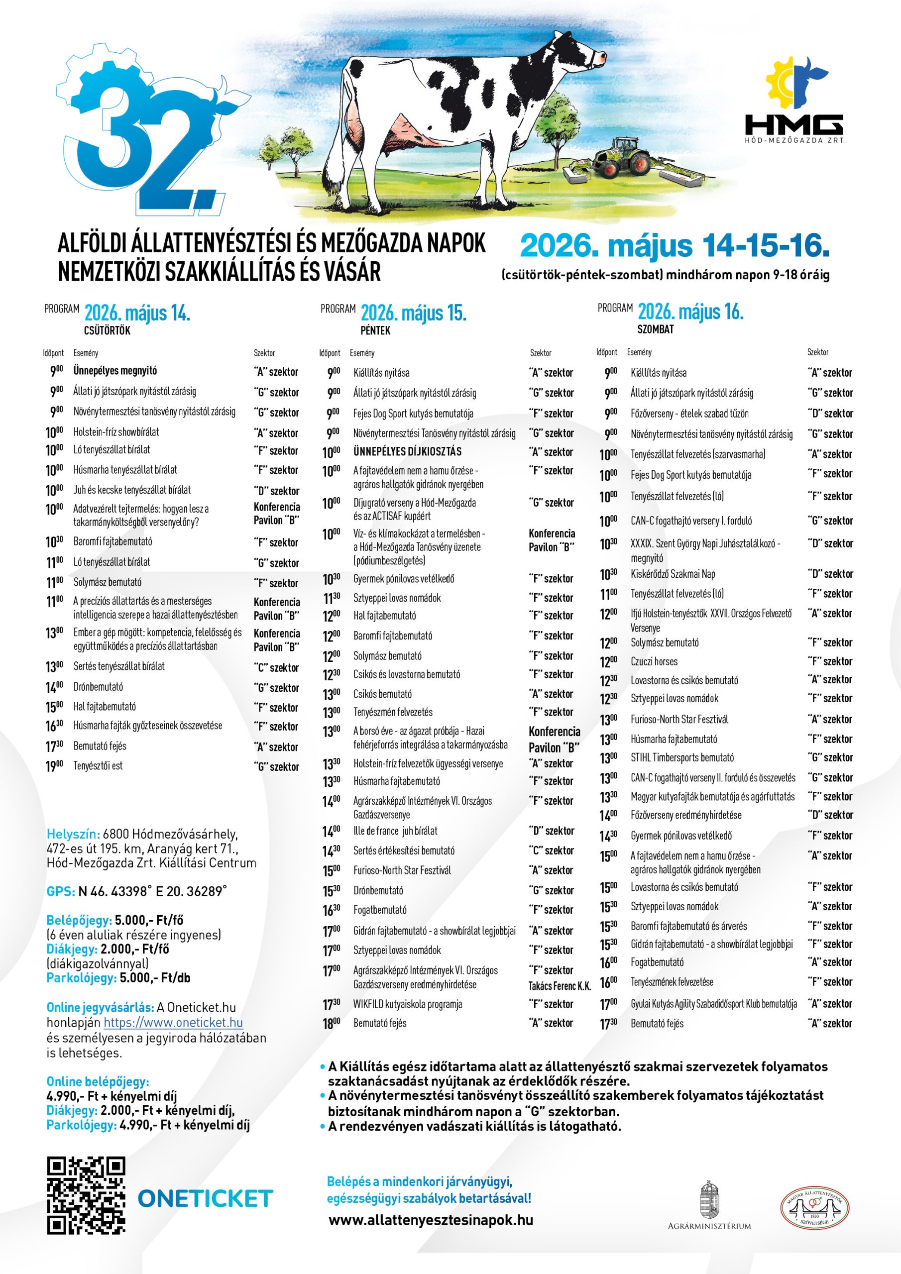 A május 14-én csütörtökön délelőtt 9-kor az ünnepélyes megnyitóval kezdődő program szakmai részében lesznek tenyészállat-, solymász- és drónbemutatók, gyermek játszópark, kutyás bemutató, főzőverseny, díjugrató verseny, lovastorna és csikós bemutató, gyermek pónilovas bemutató és számos más érdekesség. És persze meg lehet majd csodálni a kiállított különféle állatokat is.