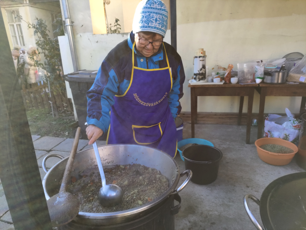 Czeller Éva ugyanis ezúttal is nagy kondérokban fűzte az ebédnek valót, külön a lencsét és a húst – köszönhetően Szabó Ferenc települési képviselő felajánlásának -, hogy abból sűrű lencsegulyás készüljön.