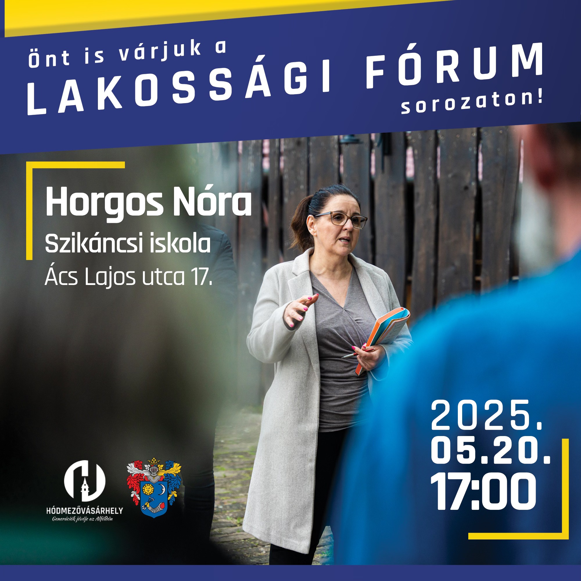 Horgos Nóra, a 10-es körzet önkormányzati képviselője lakossági fórumot tart jövő kedden, május 20-án 17 órától. Ezúttal Szikáncson, az iskola épületében – az Ács Lajos utca 17. alatt – várja a körzetben élőket a képviselő.