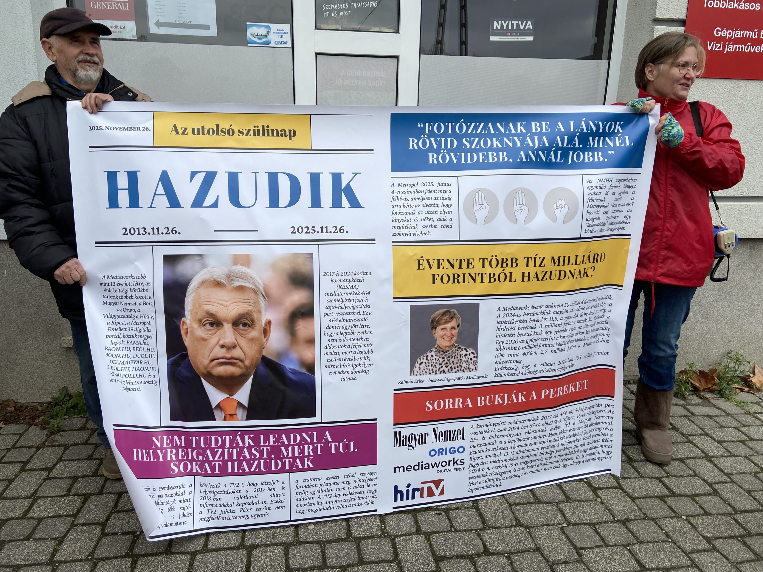 A rendezvényre a szervezők egy óriásmolinóval érkeztek, amely egy képzelt újságcímlapot ábrázolt, rajta Orbán Viktor arcképével és a médiavállalat által elkövetett bűnökkel.