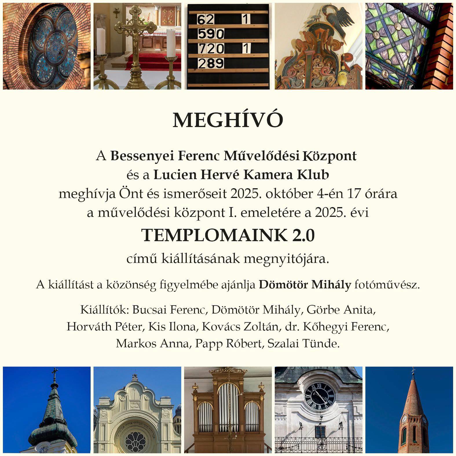 A Lucien Hervé Kamera Klub Templomaink 2.0 című tárlata szombaton délután 5 órakor nyílik meg a Bessenyei Ferenc Művelődési Központban.