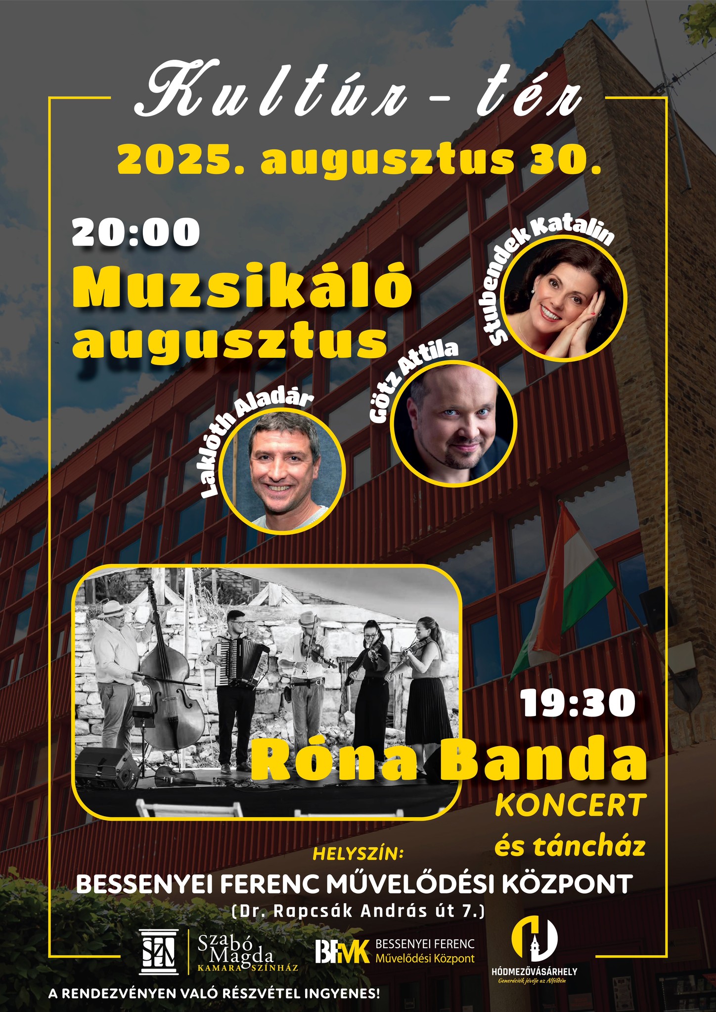 Augusztus 30-án Muzsikáló augusztus című előadásával érkezik Hódmezővásárhelyre Stubendek Katalin, Götz Attila és Laklóth Aladár, de ugyanezen a napon a Róna Banda is fellép.