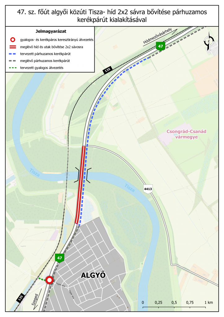 „Tavaly eldőlt, hogy az algyői Tisza-híd 2×2 sávosítása zöld utat kap. Ma pedig már ott tartunk, hogy megvan a tervező, akinek az a feladata hogy a meglévő híd mellé egy új, 500 méter hosszú, 2×1 sávos szerkezetet és hozzá kapcsolódóan 1.2 km utat tervezzen 2025-ig” – jelentette be közösségi oldalán Lázár János egy héttel azután, hogy az Építési és Közlekedési Minisztérium beruházási portálján megjelent a 47. sz. főút algyői közúti Tisza-híd 2×2 sávra bővítése párhuzamos kerékpárút kialakításával címet viselő projekt előkészítési terveiről szóló beszámoló.