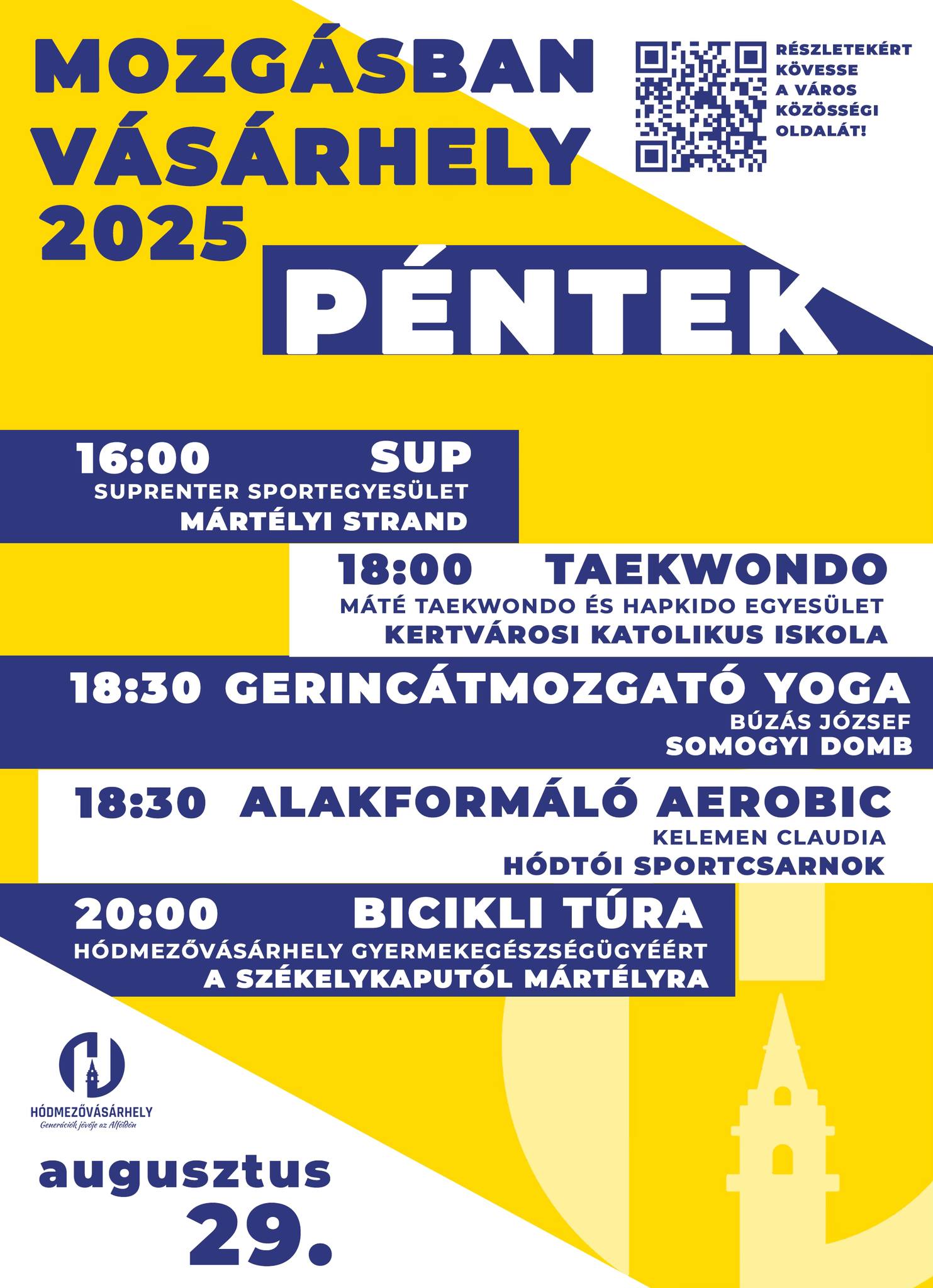 16 órakor a mártélyi strandon kipróbálhatjuk a supot, a Kertvárosi Katolikus Iskolában taekwondózhatunk 18 órától, a Somogyi dombon pedig átmozgató jóga lesz 18:30-kor. Szintén fél 7-kor a Hódtói Sportcsarnokban alakformáló aerobikra várják az érdeklődőket, végül este 8-kor kerékpártúra indul Mártélyra.