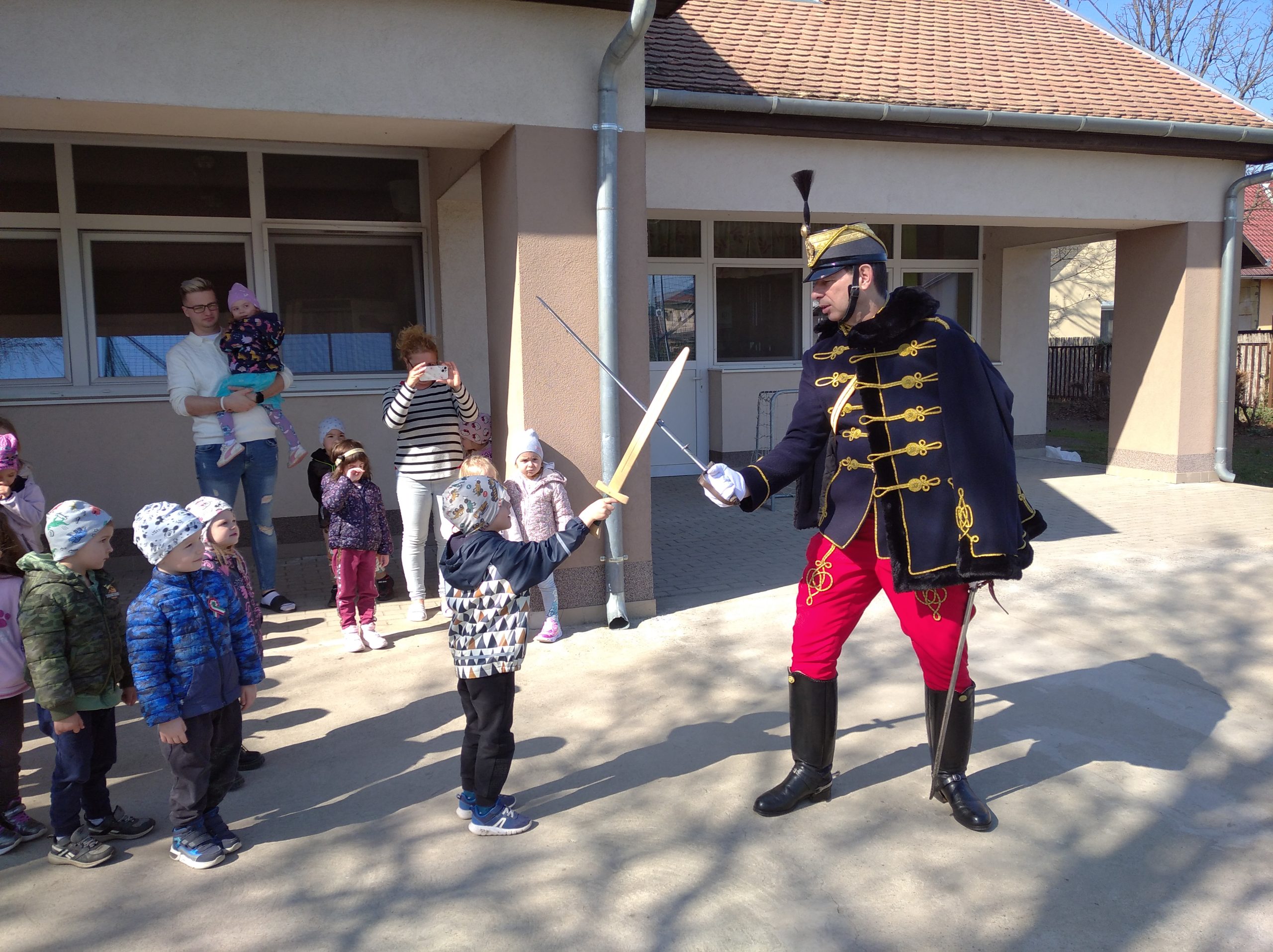 Hagyományőrző, a nemzeti ünnepre hangoló rendezvényt tartottak a Magvető Utcai Óvodában ma délelőtt. Az eseményen egy táncházon, majd egy kültéri huszárbemutatón vehettek részt a gyermekek, akik két huszár segítségével kipróbálhatták, milyen a nyeregben ülni, egyikükkel pedig még vívhattak is.