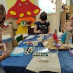 Aztán a kisfiúk horgásztak (majd a kifogott kishalakat vissza is dobták) a kislányok pedig nekiálltak vízfestékkel kifesteni a tengeri csillagot, a rákot, a bálnát és a többi vízi élőlény papírfiguráit. Két ügyes kisfiú pedig gyurmából másodpercek alatt készített egy nagyobb testű kék színű halat és egy piros csikóhalat.
