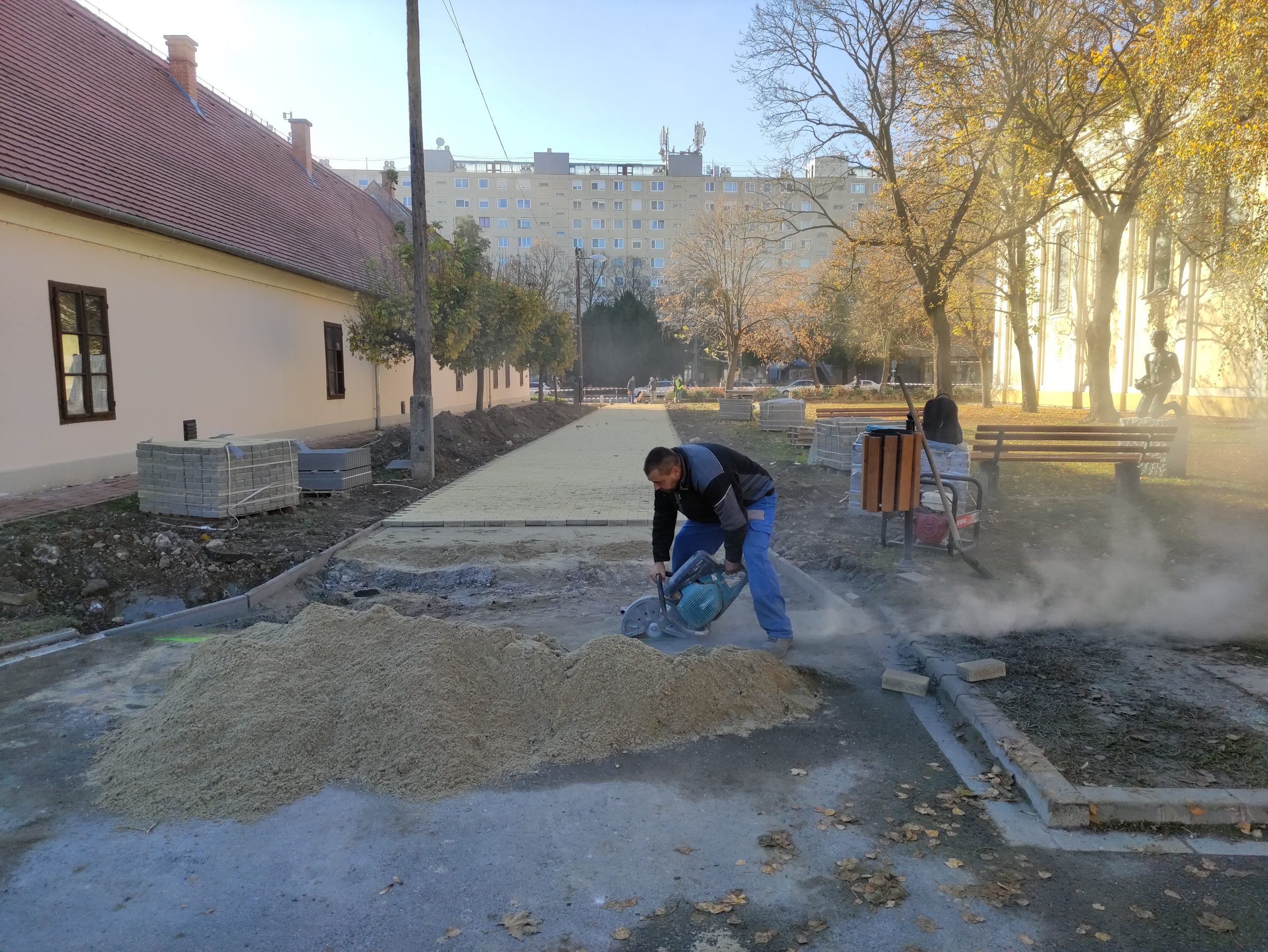 A jelenleg is zajló városi járdaépítési program során azonban ezen az oldalon is térkőburkolatot kap a járda. A Szent Antal utcától a Lánc utcáig folyamatosan géppel törték fel az aszfaltot, majd szállították el, hogy a helyére új burkolat kerüljön. A főtér felőli részen már leterítették az alap egyik rétegét, a homokágyat, miközben a túlsó végén még a régi járda és annak betonalapja feltörésén dolgoznak a kivitelezők.