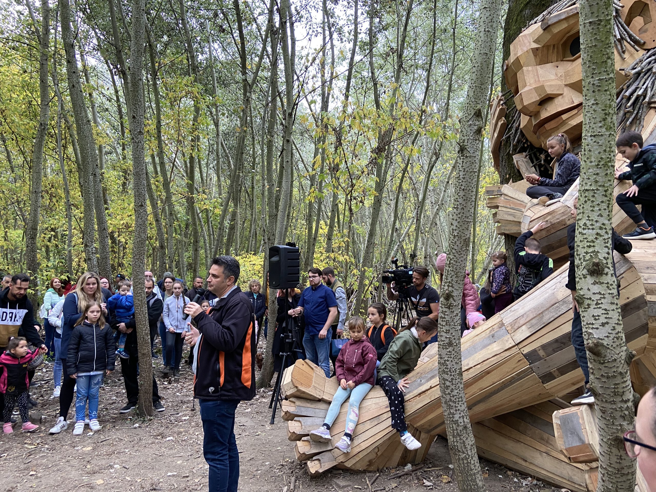 A szombat délutáni trollszobor-átadóra benépesült a vásárhelyi erdő, valószínűleg sohasem voltak még itt egyszerre ennyien. Már jóval a rendezvény kezdete előtt egyre többen érkeztek – köztük nagyon sok család kisebb-nagyobb gyerekekkel, gyalog, rollerrel, kerékpárral vagy autóval.