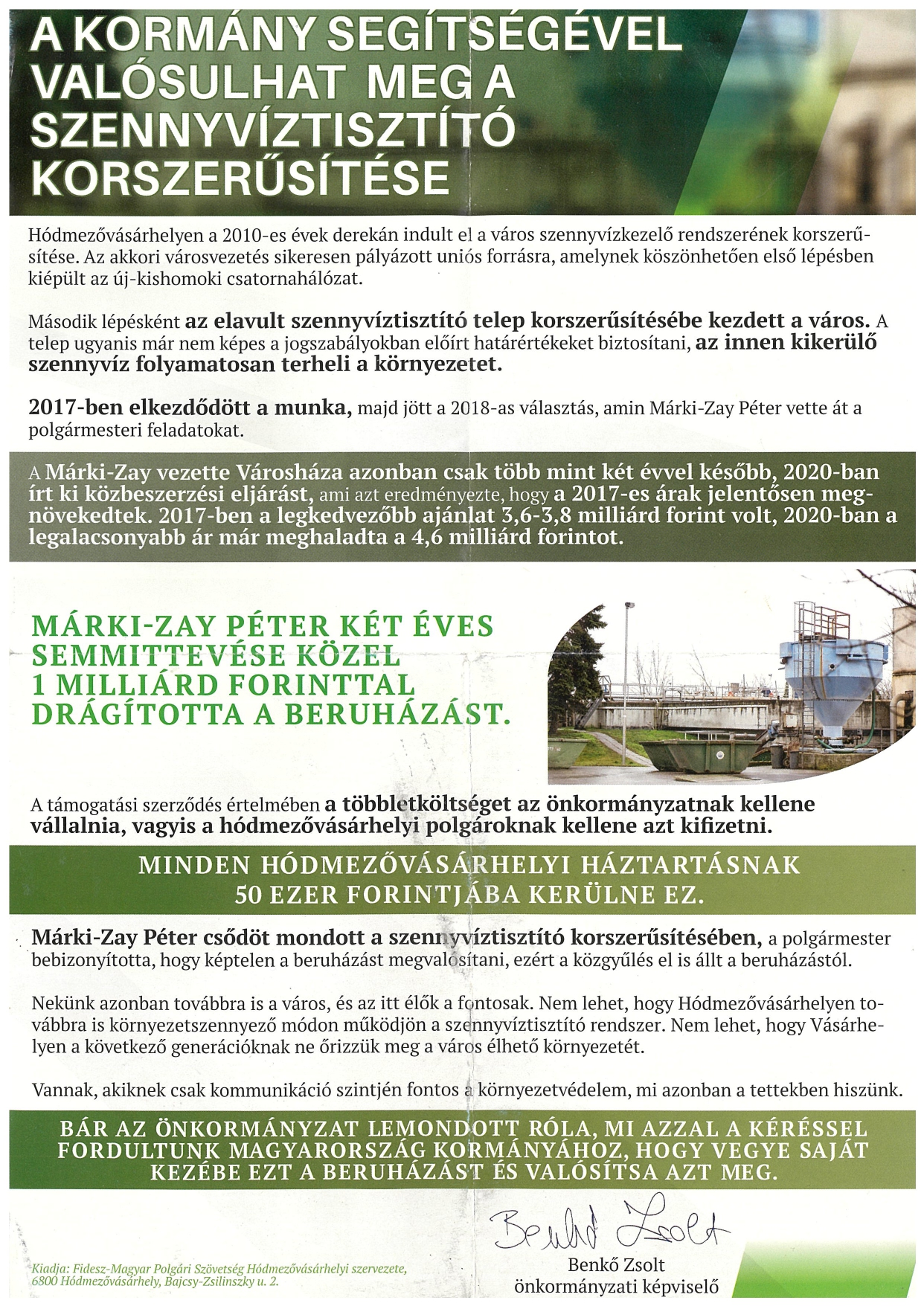 Nagy csend övezte az utóbbi bő egy évben a szennyvíztisztító felújítását, amelyre pedig égető szükség volna, hiszen a Hódmezővásárhely az egyetlen a tízezer fő feletti magyar települések közül, ahol a szennyvíztisztító nem felel meg az európai uniós előírásoknak. A projektet még 2023 februárjában kaszálta el a Lázár János vezette minisztérium, a jelentős költségnövekményre hivatkozva, melyet a kormány akkor a szomszédos háború okán a honvédelem és a rezsicsökkentés megvédésének magasztos céljaira hivatkozva nem kívánt fedezni.