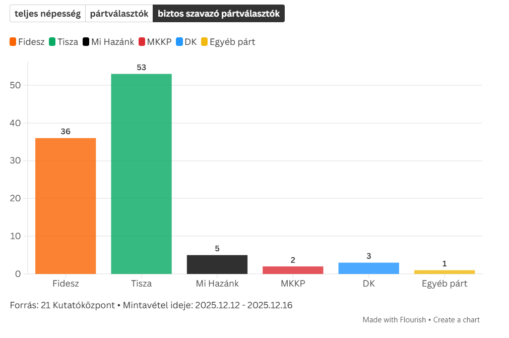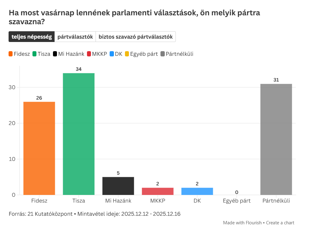 A december 12. és 16. között végzett felmérés szerint a Tisza Párt 34, a Fidesz 26 százalékon áll a teljes népességben, a pártot választani tudók között pedig 49–38 az arány.