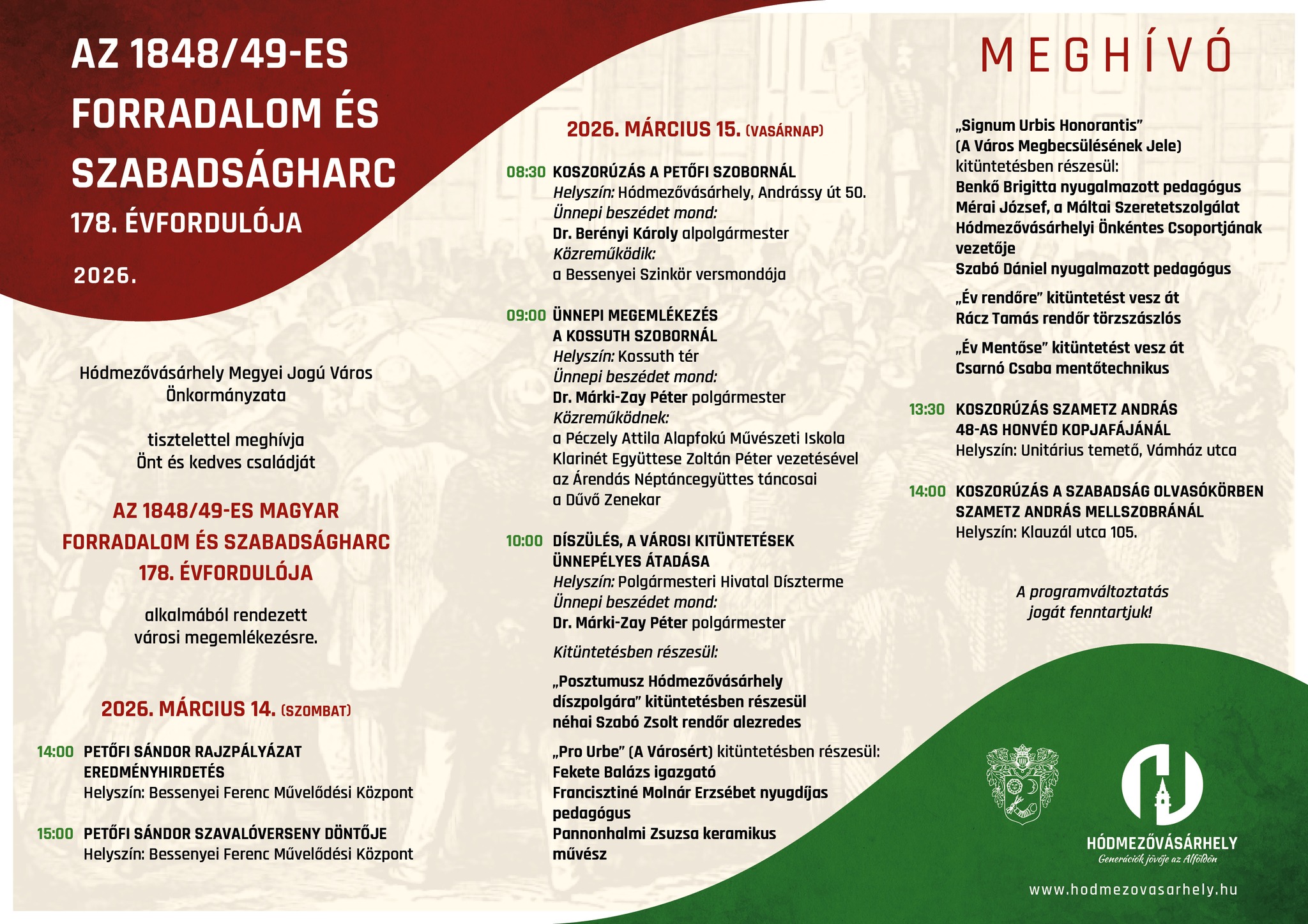 Méltó és gazdag programsorozattal készül Hódmezővásárhely az 1848/49-es forradalom és szabadságharc 178. évfordulójának megünneplésére. A kétnapos városi megemlékezésen kulturális programok, koszorúzások és ünnepi díszközgyűlés is várja az érdeklődőket.