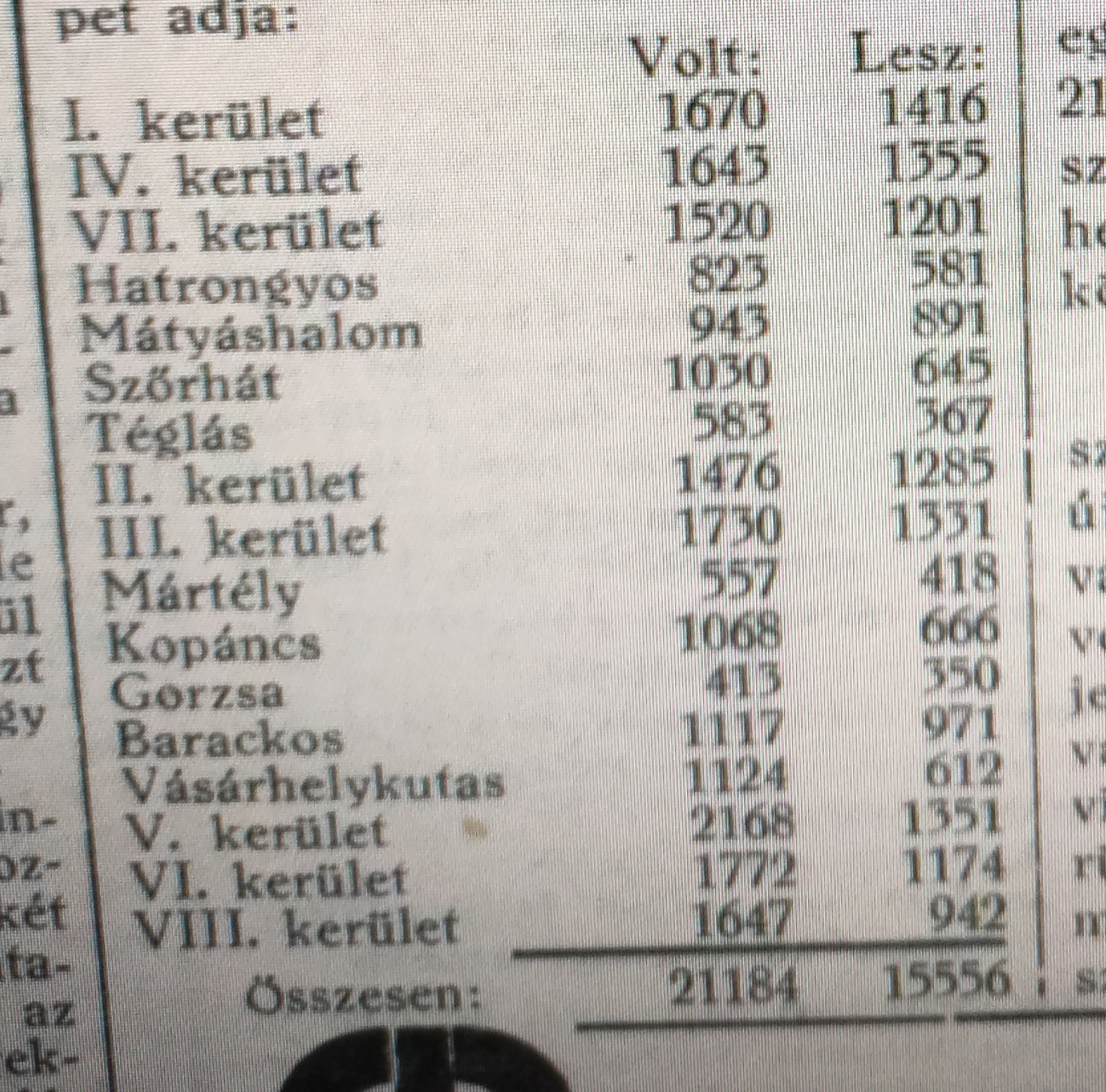 „Csütörtök este befejezték azt a lázas munkát, amely Endrey Béla polgármester személyes irányítása mellett Darabos István dr. tb. tanácsnok és Pokomándy Gyula dr. fh. aljegyző felügyeletével ment végbe. A végeredmény szerint az eddigi és a most készült – 1939. évre érvényes ideiglenes névjegyzék összehasonlítására a következő képet adja: