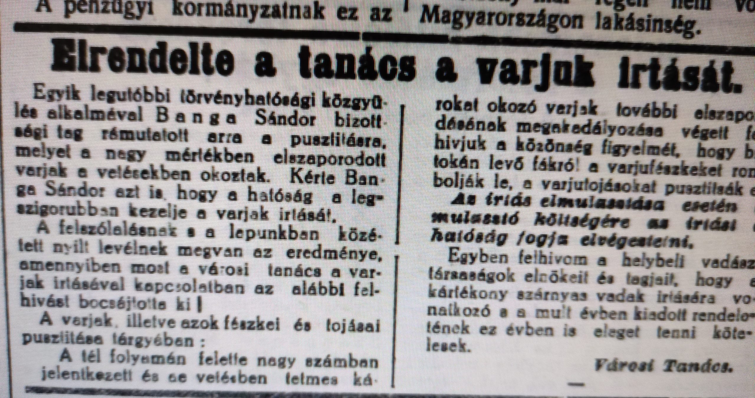 „A tél folyamán felette nagy számban jelentkezett, és a vetésben félelmetes károkat okozó varjak további elszaporodásának megakadályozása végett felhívjuk a közönség figyelmét, hogy a birtokán lévő fáról a varjúfészkeket rombolják le, a varjútojásokat pusztítsák el. Az irtás elmulasztása esetén a gazda költségére azt a hatóság fogja elvégeztetni.”