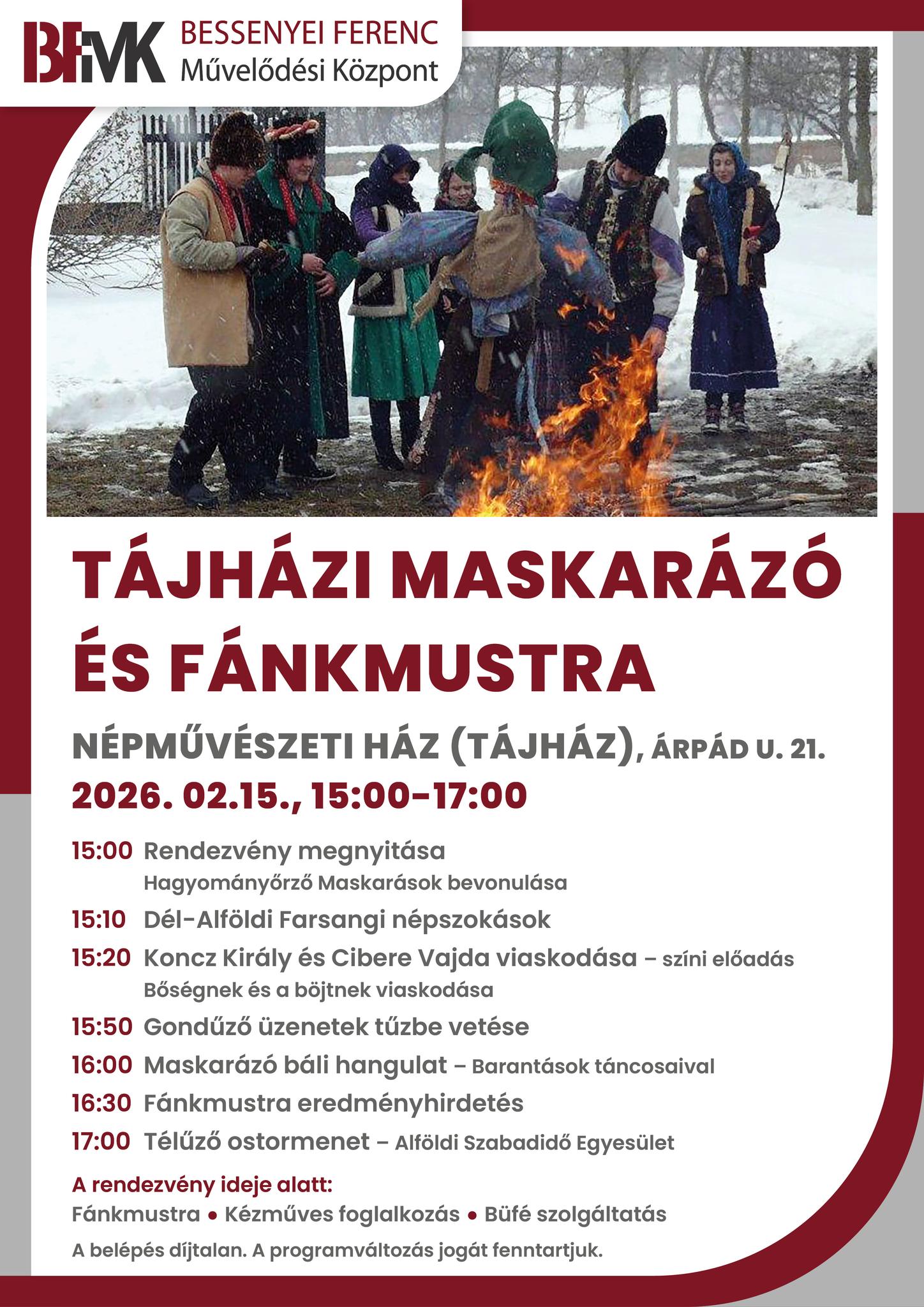 Nem fog unatkozni senki, aki vasárnap délután ellátogat az Árpád utcai Tájház programjára. A 3 órakor kezdődő rendezvény megnyitóval és a hagyományőrző maskarások bevonulásával veszi kezdetét, majd a dél-alföldi népszokások bemutatását követően összecsap egymással a bőséget és az ínséget jelképező Konc király és Cibere vajda.
