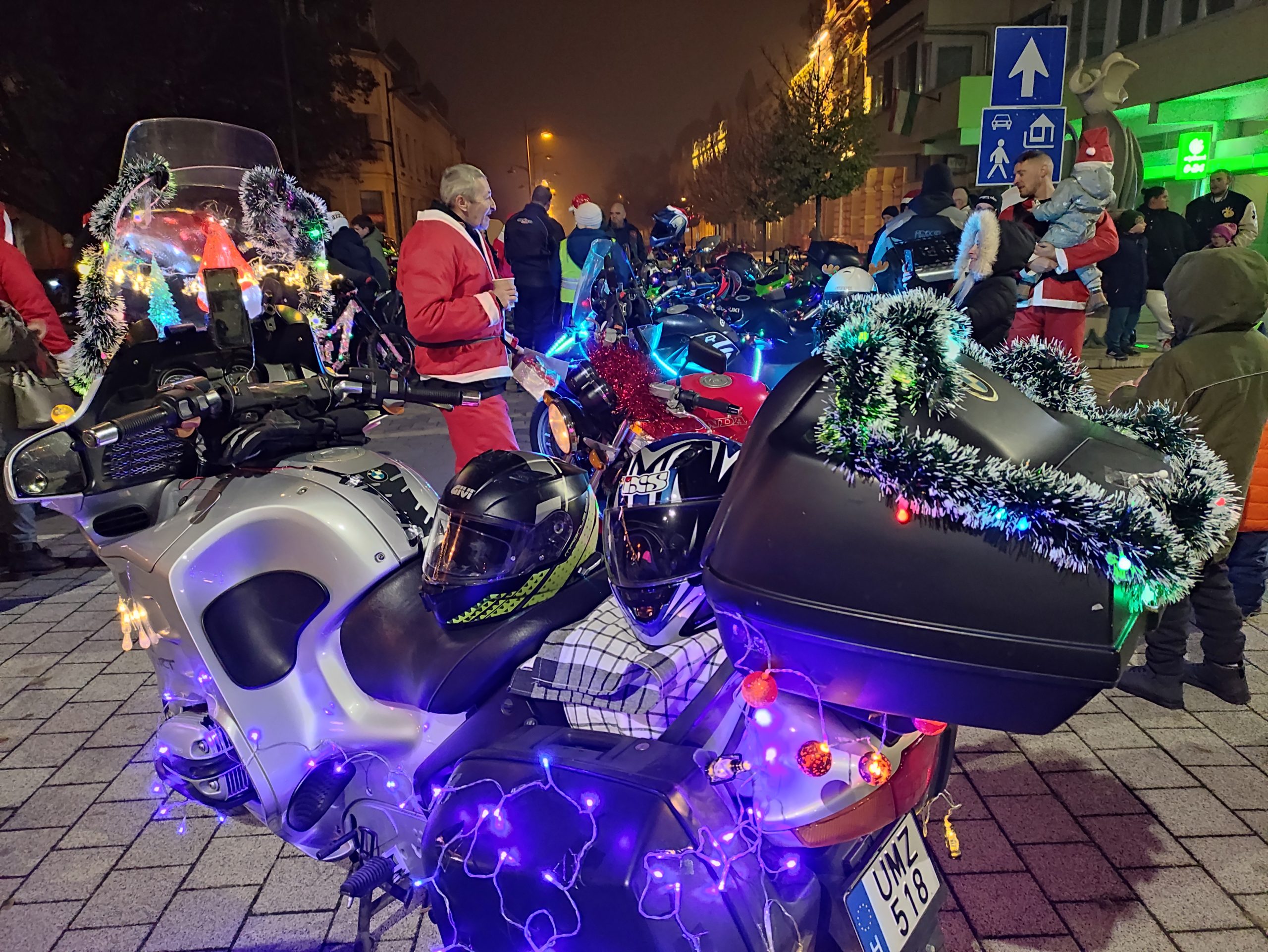A Mikulásruhás, -sapkás motorosok ugyanis nekiindultak, s járgányaik mintha egy-egy mozgó karácsonyfa lett volna, úgy ki voltak világítva.