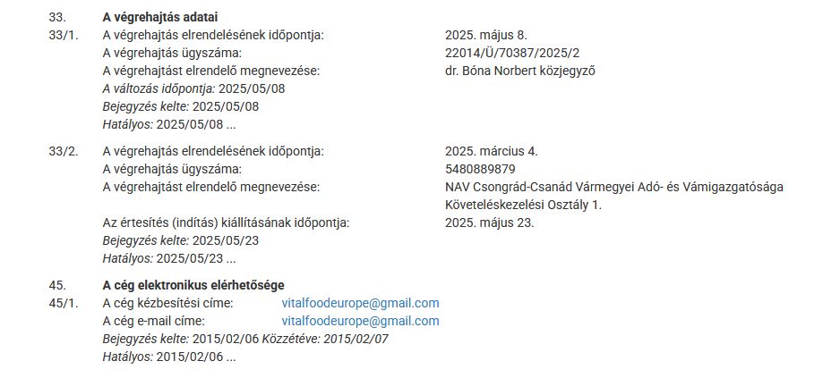 Az Igazságügyi Minisztérium e-cégjegyzékén közzétett adatai szerint a NAV Csongrád-Csanád Vármegyei Adó- és Vámigazgatósága Követeléskezelési Osztálya március 4-én, míg dr. Bóna Norbert közjegyző május 8-án rendelte el a végrehajtás megindítását a cég ellen.
