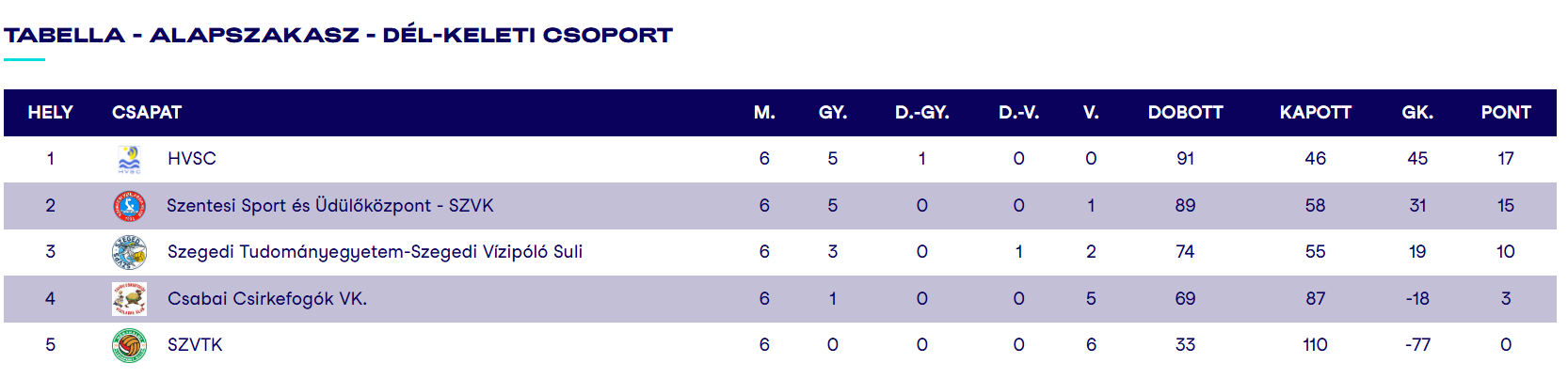 A HVSC így továbbra is, igaz szorosan, de vezeti a tabellát. A Szeged elleni győzelem kulcsfontosságú volt. A góllövőlistát 32 találattal Palotás Gergely vezeti 6 mérkőzés után.
