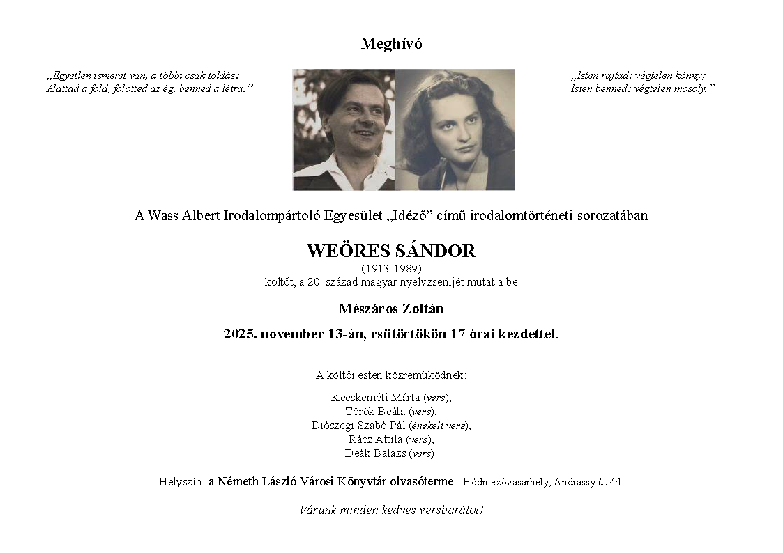 Csütörtökön este 5 órakor Weöres Sándor költőt, a XX. század magyar nyelvzsenijét mutatja be Mészáros Zoltán a könyvtárban a Wass Albert Irodalompártoló Egyesület sorozatában.