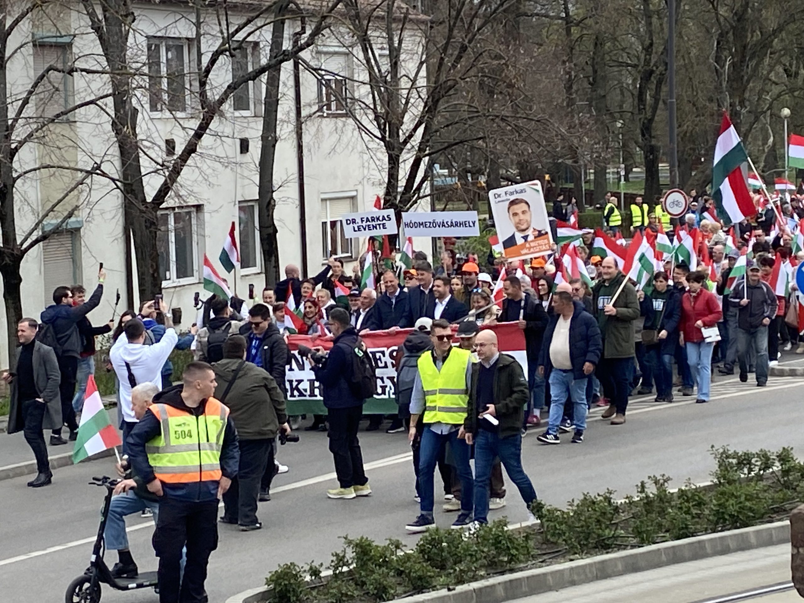 A menet valamivel három után indult el „Nem leszünk ukrán gyarmat” molinóval, a Szőnyi utcán haladva a Dr. Rapcsák András út felé. Az élén a helyi jelölt, Czirbus Gábor vonult, de ott állt az első sorban Dr. Farkas Levente, Csongrád-Csanád 1-es körzetének fideszes jelöltje is, akit egy minden bizonnyal nagyobb szegedi csoport kísért.