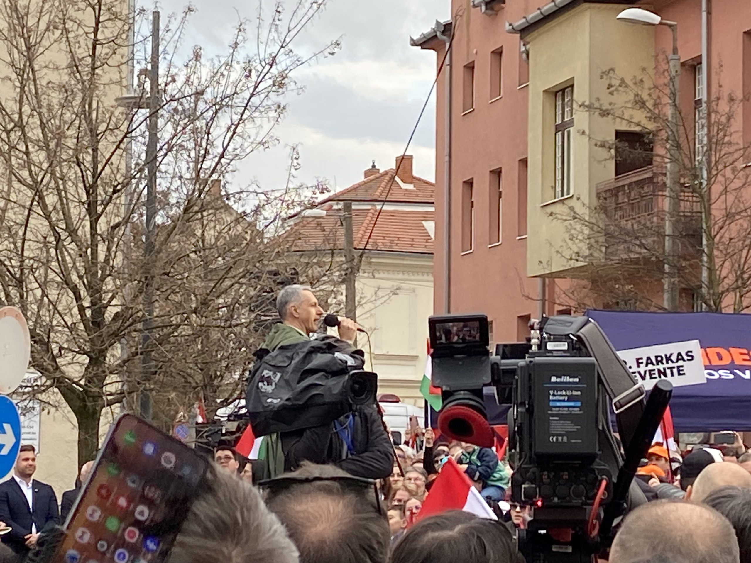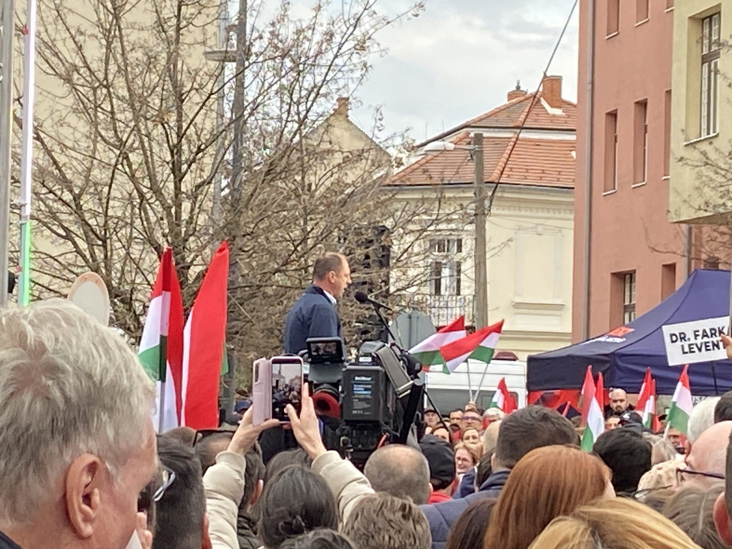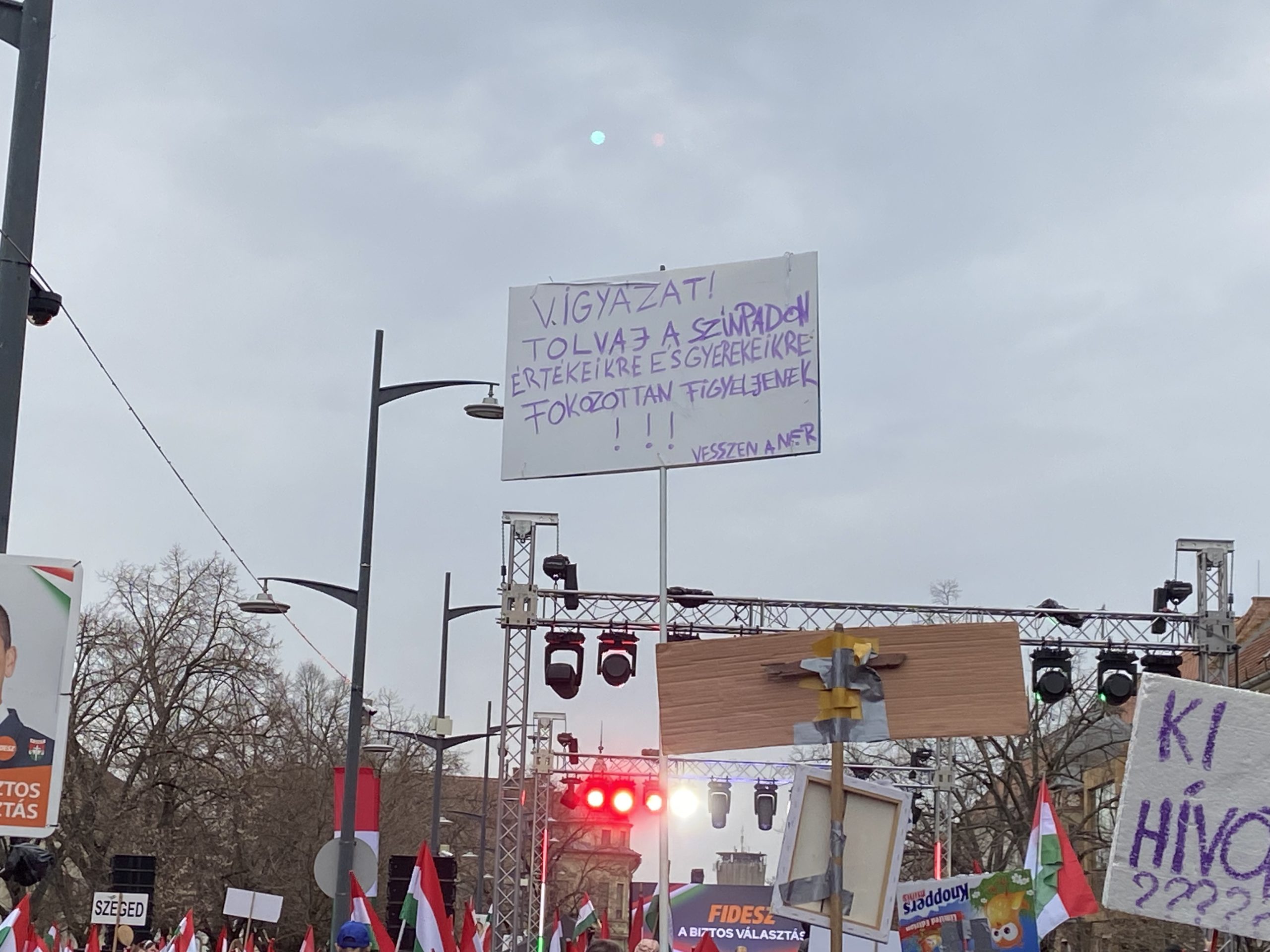 A színpad előtti, kiosztott zászlókkal sűrűn borított térben eközben újra meg újra felzúgott a „Hajrá Fidesz”, mintegy válaszul a hátrébb felhangzó bekiabálásokra. Körülbelül húsz méterrel a színpadtól ugyanis az „Orbán, takarodj”, „Ruszkik, haza„, „Mocskos Fidesz” kiabálás vegyült a beszédbe, amelyet helyi ellentüntetők és a TISZA szimpatizánsai skandáltak.