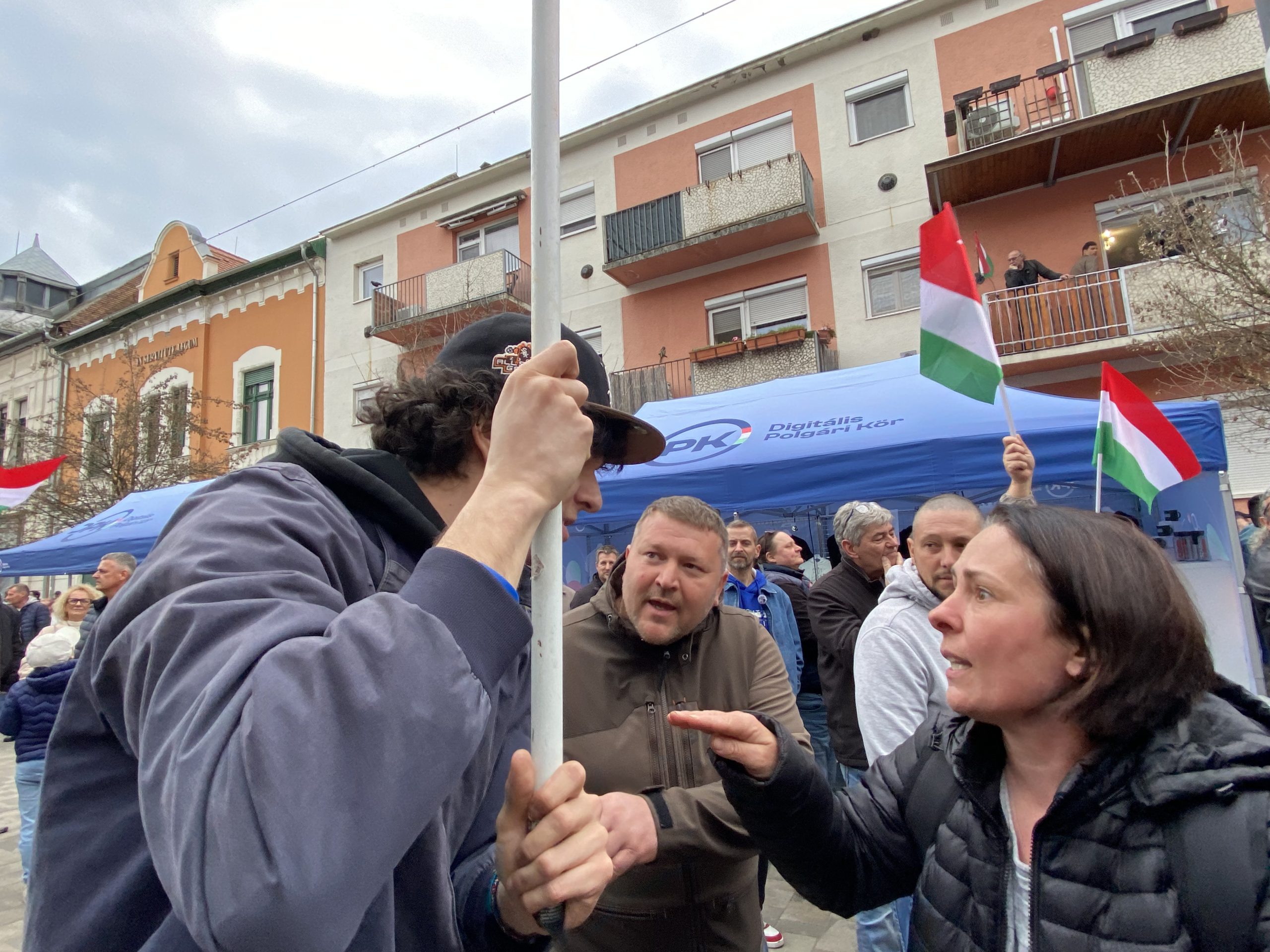 A beszéd alatt a tömegben hátrébb haladva vegyesebb tömeget lehetett látni, fideszesek és ellenzékiek nagyjából egy-egy arányban, egymásnak oda-oda kiabálva és válaszolgatva – szerencsére minden fizikai erőszak nélkül. Egy 18 év körüli fiú csendben kormánykritikus szöveggel teleírt táblát tartott magasra, miközben egy középkorú nő hevesen, vörös arccal magyarázott neki a háború veszélyeiről – a jelenet jól sűrítette a délután hangulatát.