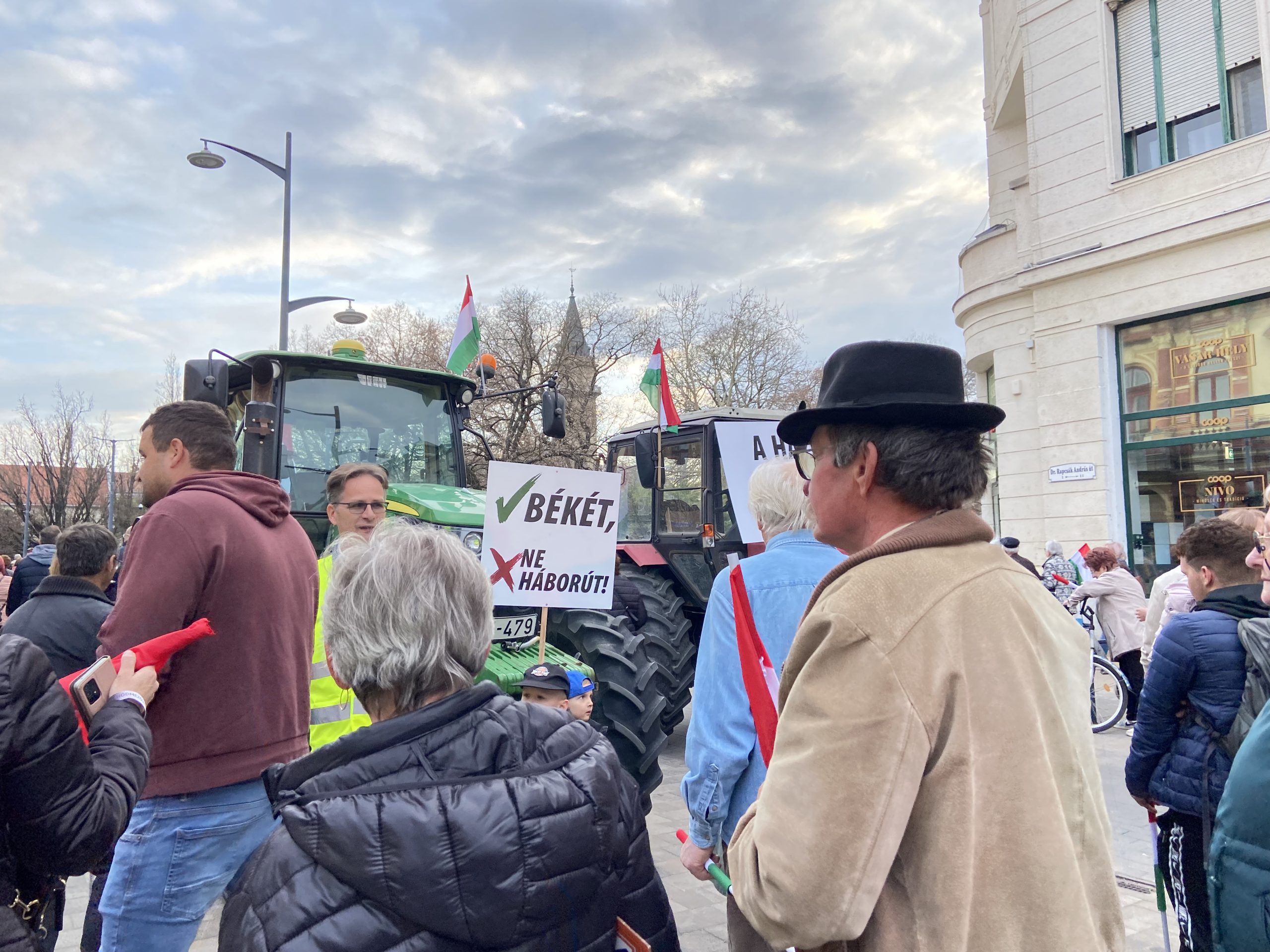 A közönség végül jelentősre duzzadt: a Rapcsák András út a színpadtól egészen a Coopig megtelt, a menet végét traktorok zárták, rajtuk feliratokkal: „Békét, ne háborút”, „Nem kérünk az ukrán gabonából”. A járműveket pedig Benkő Zsolt volt önkormányzati képviselő, a Hódmezővásárhelyi Gazdasági Egyesület elnöke “őrizte”.