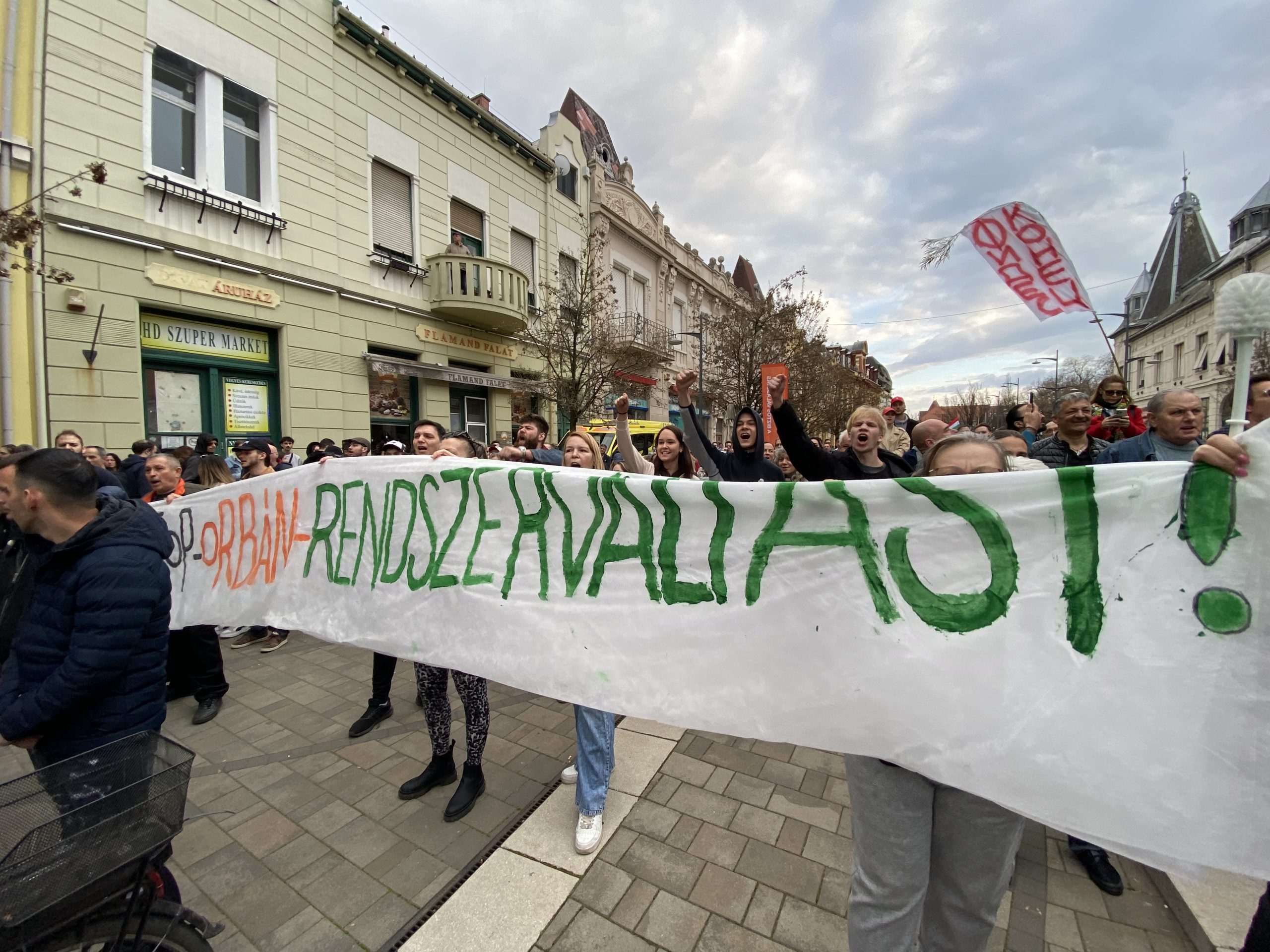 A menet valamivel három után indult el „Nem leszünk ukrán gyarmat” molinóval, a Szőnyi utcán haladva a Dr. Rapcsák András út felé. Az élén a helyi jelölt, Czirbus Gábor vonult, de ott állt az első sorban Dr. Farkas Levente, Csongrád-Csanád 1-es körzetének fideszes jelöltje is, akit egy minden bizonnyal nagyobb szegedi csoport kísért.